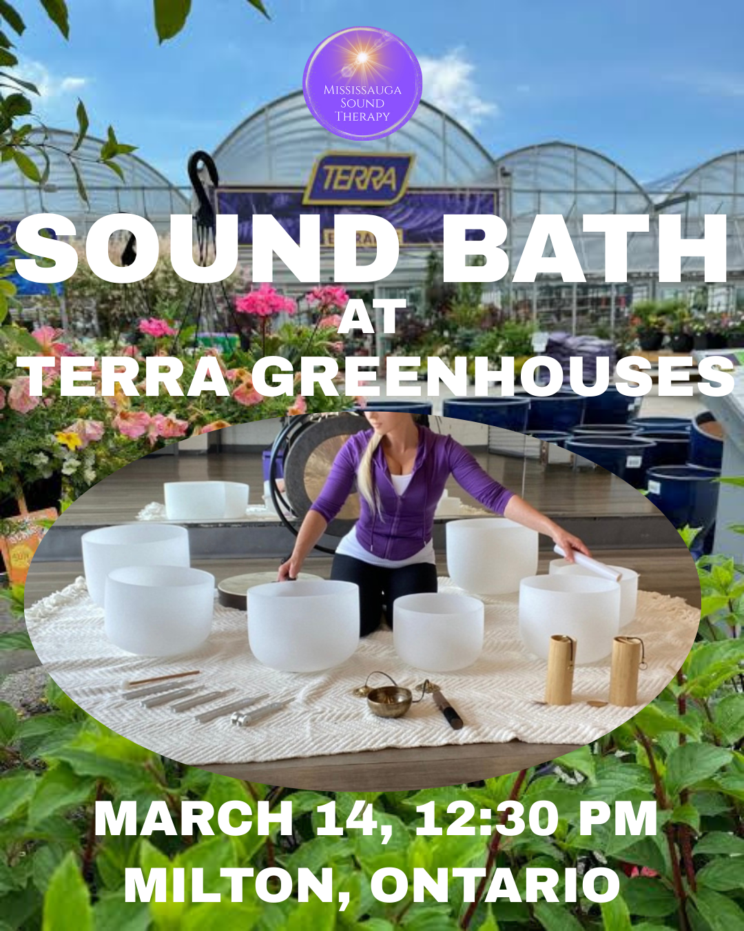 🌿 Join Lisa Boon, certified sound therapy and sylvotherapy (forest therapy) practitioner, for a rejuvenating sound bath at the beautiful Terra Greenhouses in Milton!