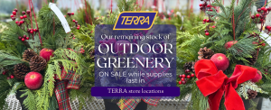 Our remaining selection of fresh, handmade outdoor greens arrangements are now on sale and available only in TERRA store locations. Selection will vary by store.