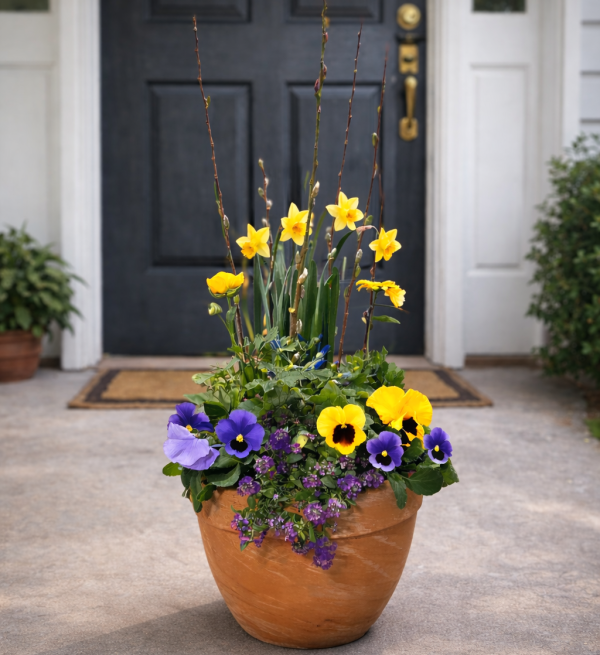 Add a fresh pop of spring colour to your doorstep with this beautifully arranged 12” Spring Mixed Terracotta Planter. Designed with a vibrant mix of seasonal textures, this planter features natural pussy willow branches, a spring bulb (tulip or daffodil), and a curated blend of spring annuals for a full, eye-catching display.