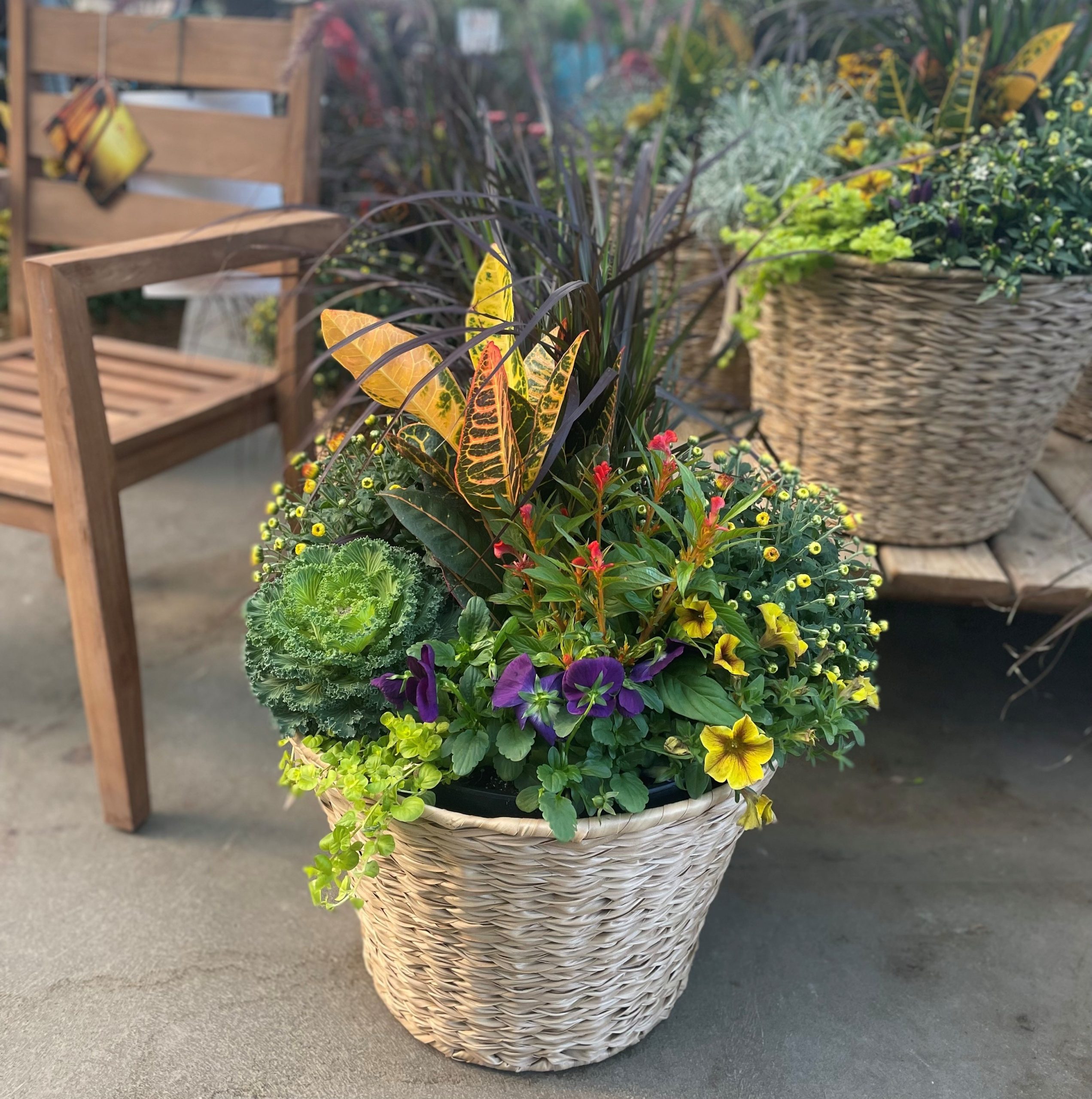 Celebrate the season with this charming 16″ fall planter set in a rattan basket. Bursting with texture and color, it features the graceful height of purple fountain grass, the bold foliage of croton, and the classic autumn blooms of a vibrant fall mum. Accented with assorted fall annuals, this planter brings a warm, inviting touch to porches, patios, or entryways all season long.