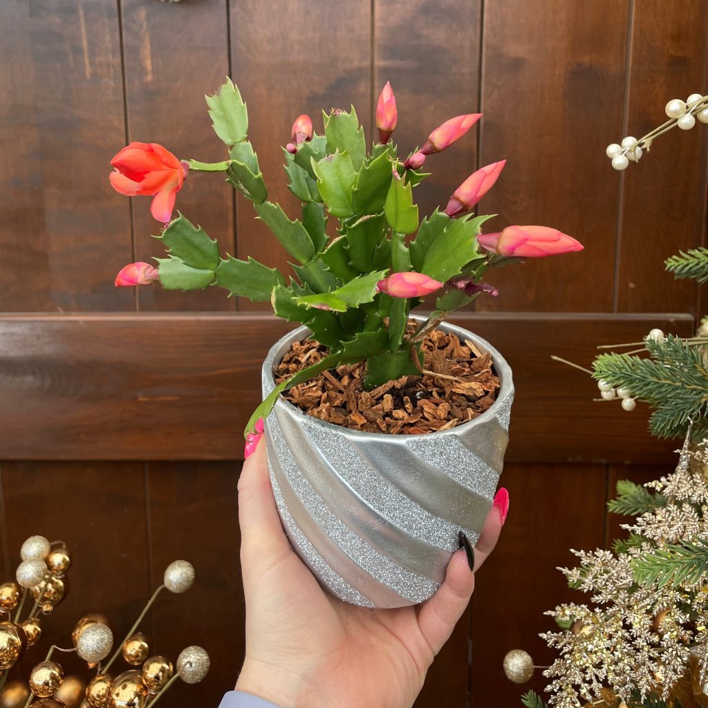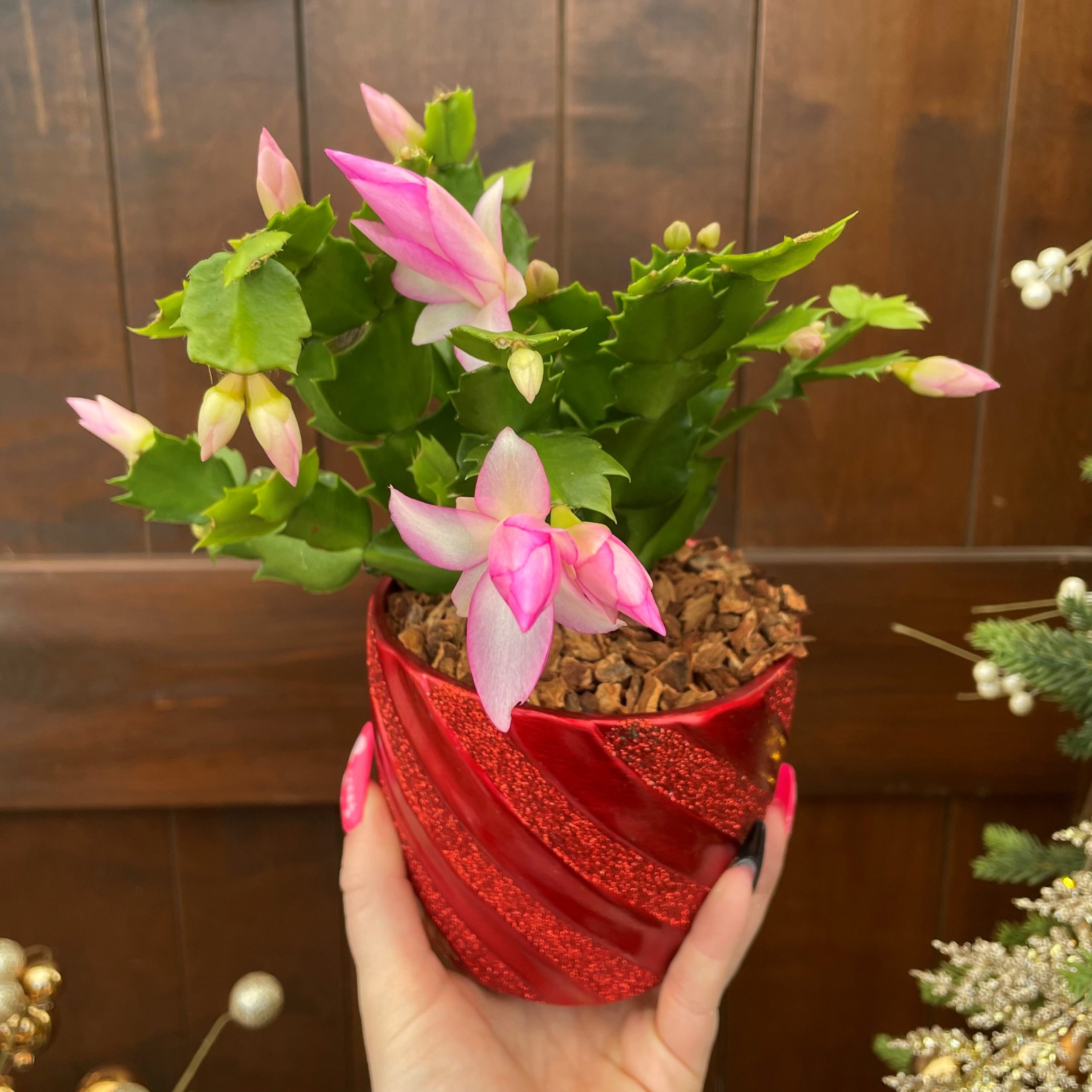 A beautiful Christmas Cactus in a variety of festive ceramic pots. The Zygo features gracefully arching branches made up of flat, glossy green segments that come alive with colourful, tubular blooms during the holiday season.