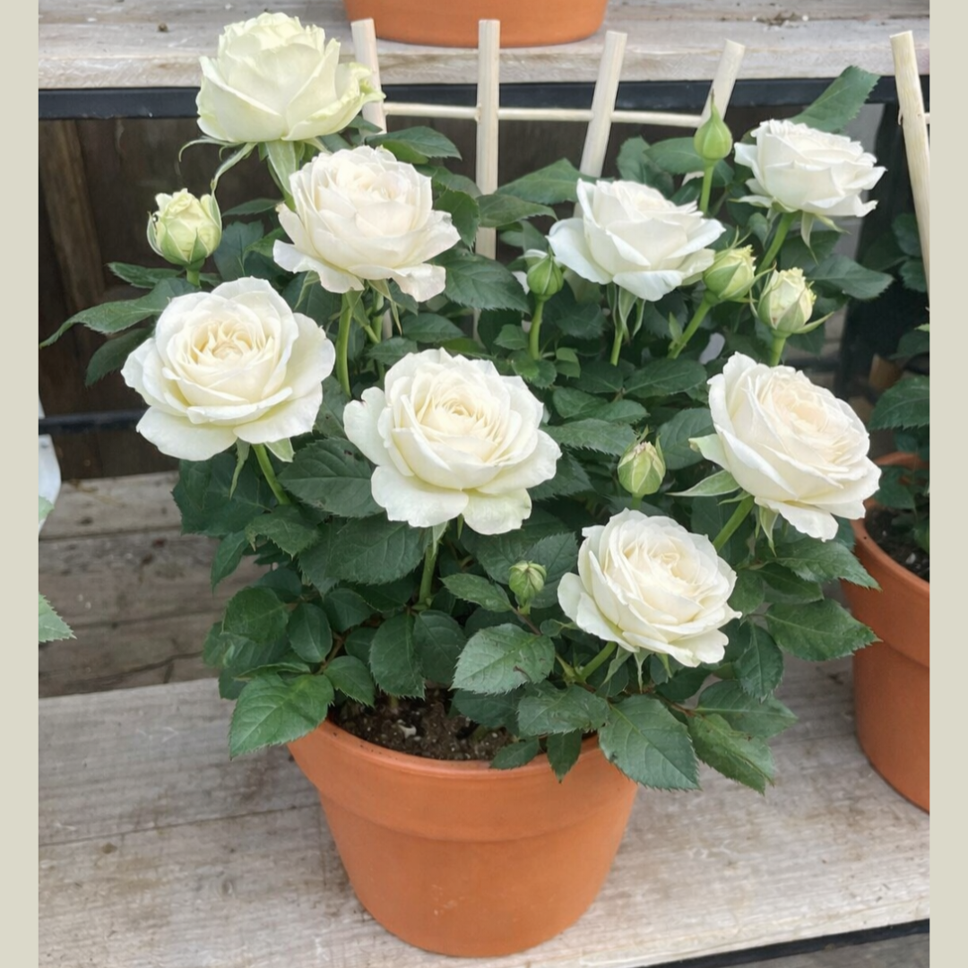 Bring timeless charm to any space with this 6″ mini rose, beautifully presented in a classic terracotta pot with an attached trellis for gentle support. Bursting with delicate blooms. Perfect for bright windowsills, patios, or gifting, these compact roses add elegance and warmth wherever they’re placed. Rose colour will vary.