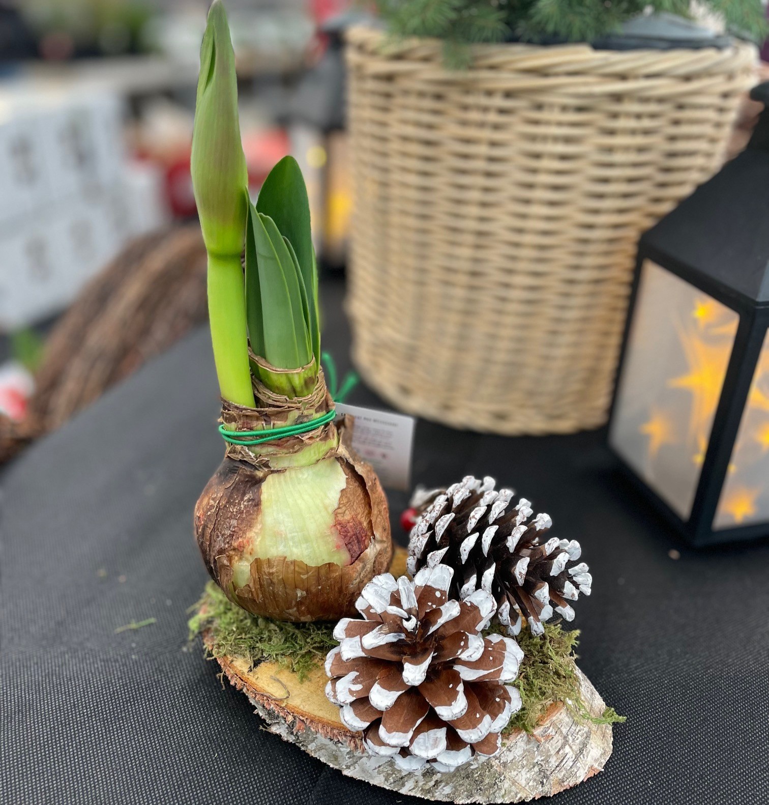 Bring natural winter beauty indoors with this Amaryllis bulb display, set on a rustic wood slice and accented with moss and frosted pinecones for a cozy, woodland feel. Easy to grow and care for, this amaryllis will soon send up tall stems topped with stunning, trumpet-shaped blooms—adding warmth and elegance to your holiday décor.