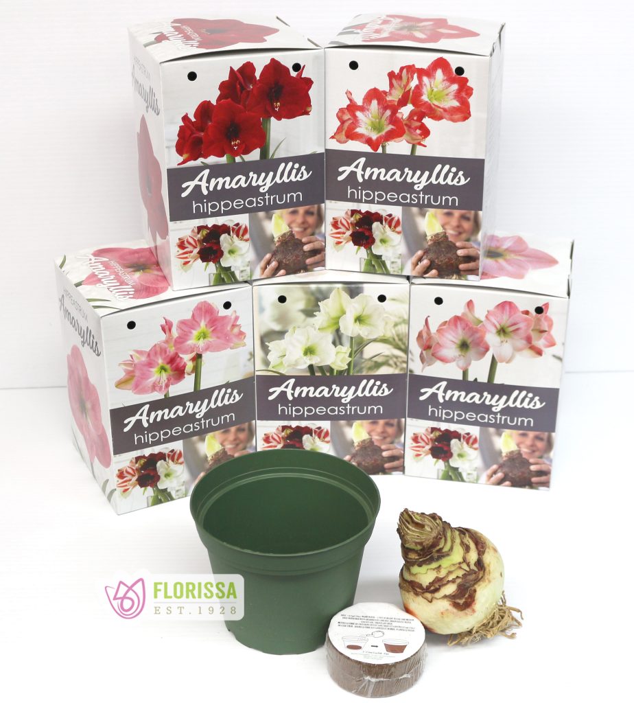 Amaryllis are easy to grow and great for gift giving. Kit includes one amaryllis bulb, soil, and a plastic pot.