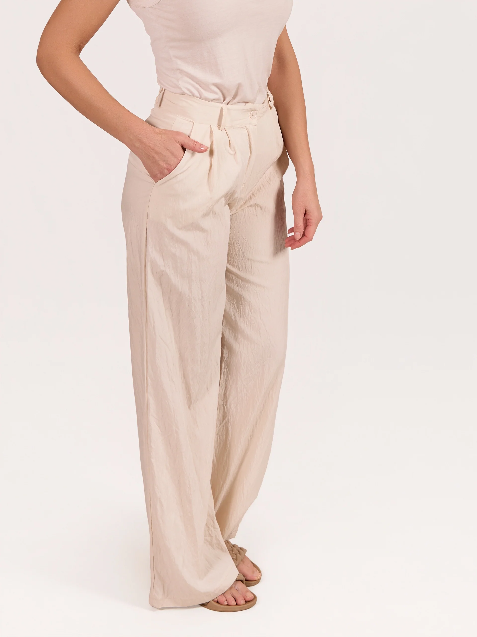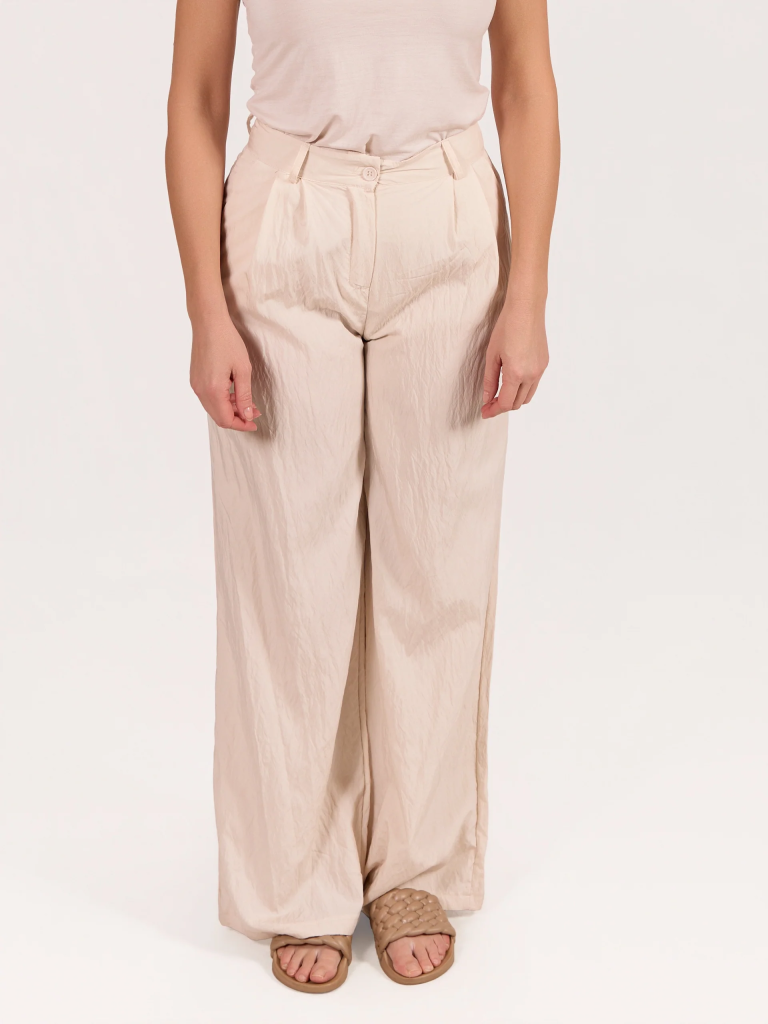 Effortlessly modern, these beige crinkle pant features a button-front detail and textured finish for added dimension. The lightweight fabric and relaxed silhouette provide breathable comfort, while the tailored structure maintains a polished look. Perfect for pairing with blouses, knit tops, or coordinating jackets, this versatile pant transitions seamlessly from refined daytime styling to elevated casual wear.