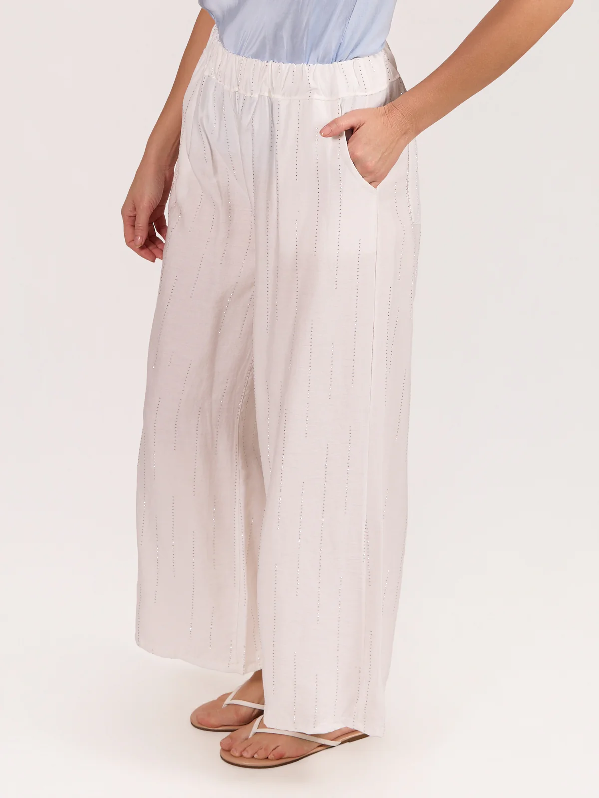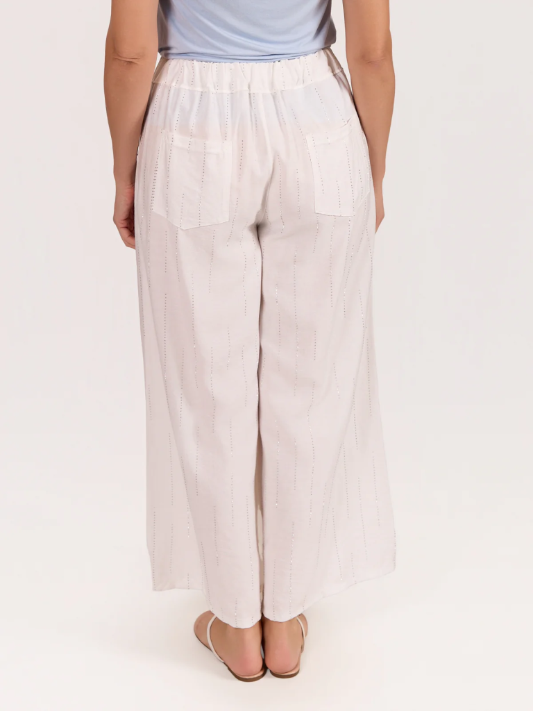 Modern and statement-making, this white pull-on wide leg pant features subtle studded detailing for a refined edge. Designed with a comfortable elastic waistband and flowing wide leg silhouette, it offers effortless wear while maintaining a polished look. Perfect for pairing with blouses, fitted tops, or structured jackets, this versatile wide leg pant transitions seamlessly from chic daytime styling to elevated evening outfits.