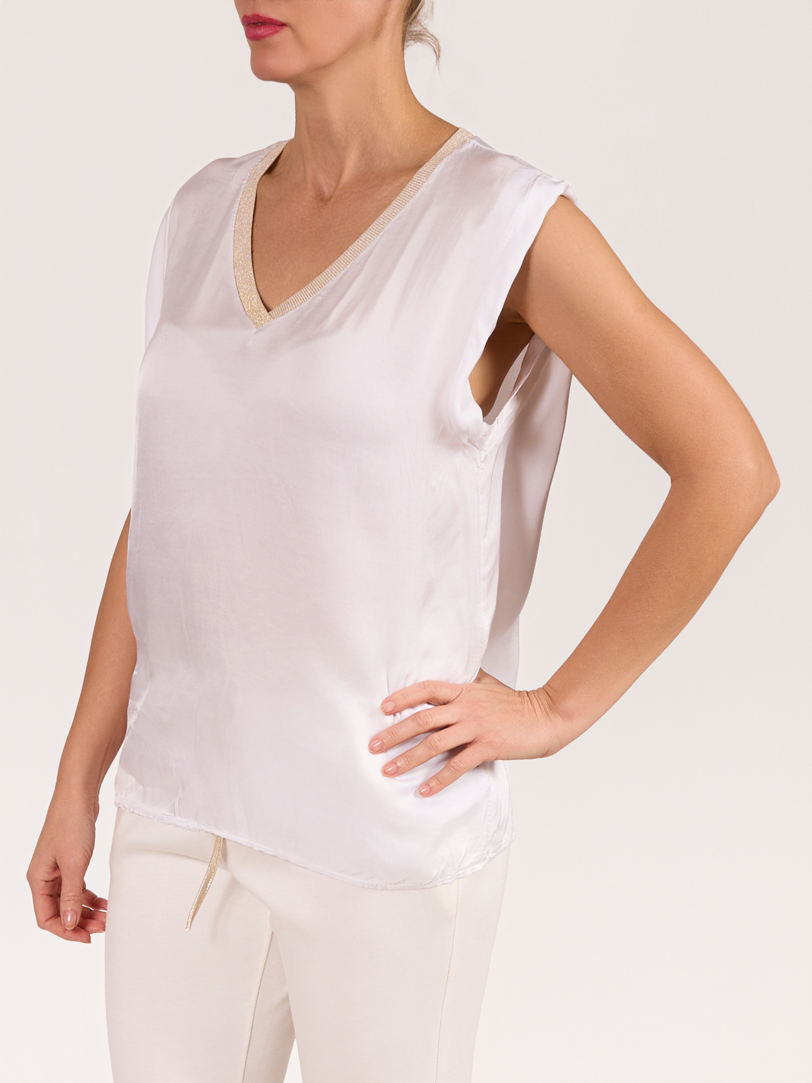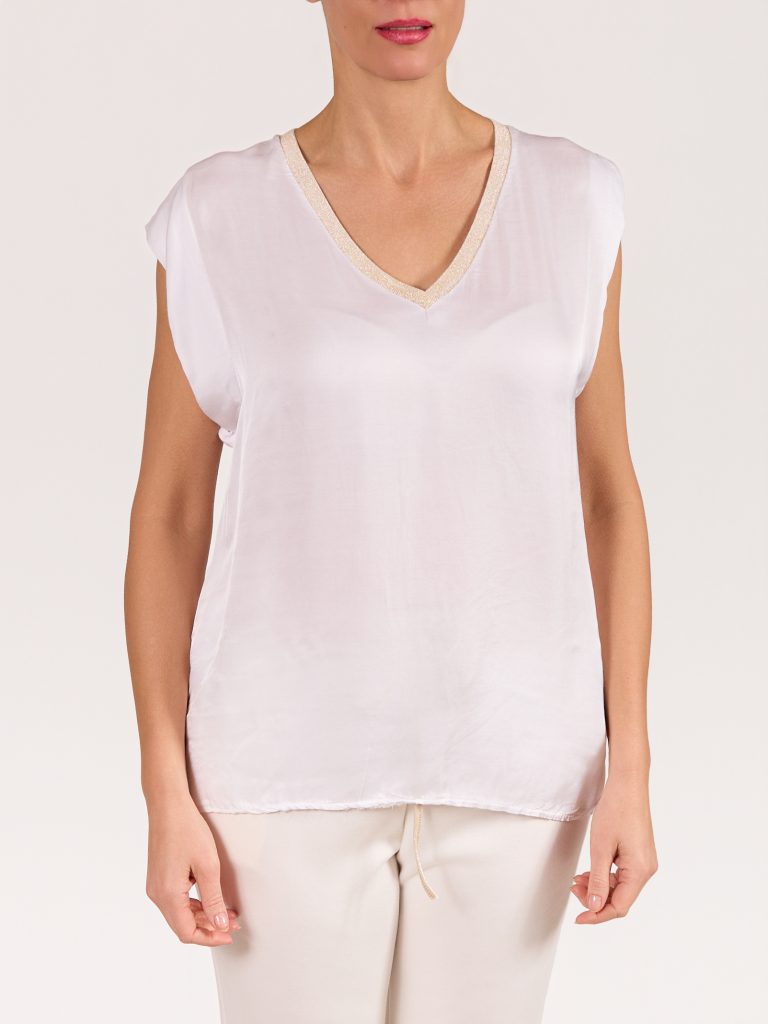Refined and luminous, this satin short-sleeve top features a flattering V-neckline enhanced with subtle lurex detailing for a touch of elegant shimmer. The smooth satin finish drapes beautifully, offering a polished silhouette that transitions effortlessly from daytime sophistication to evening styling. Perfect for pairing with tailored pants, skirts, or denim, this versatile V neck top delivers modern elegance with understated shine