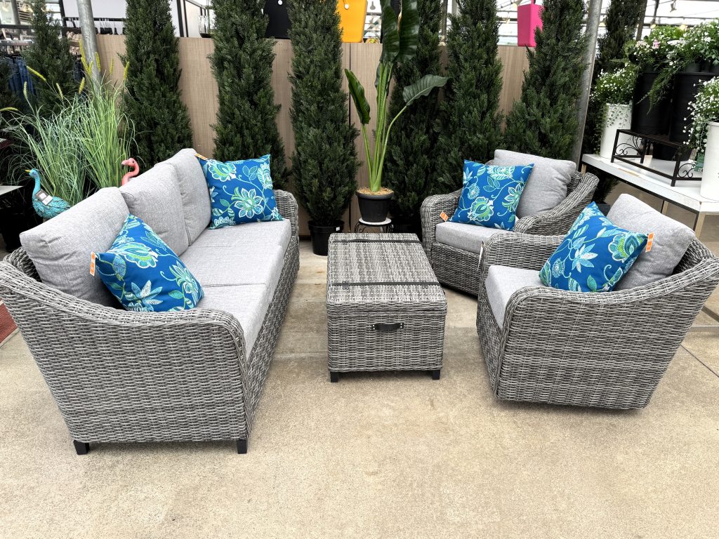 Resin Wicker: Polyethylene (PE) Wicker, resistant to mildew, and chlorine. Handwoven half moon basket weave in a textured rich grey resin wicker