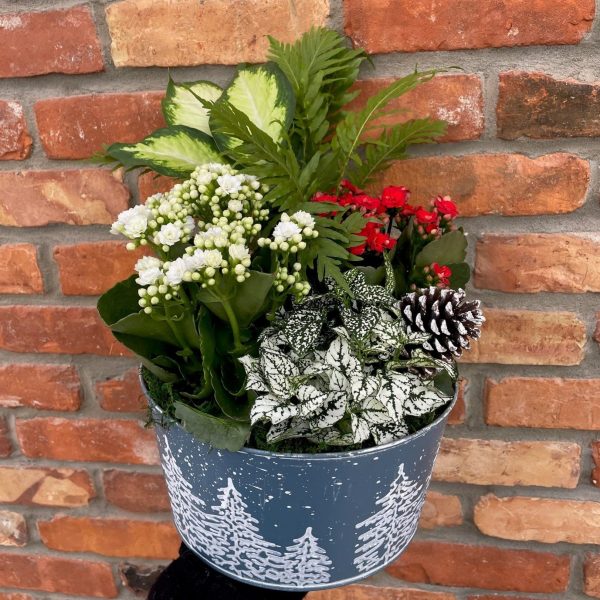 Bring the beauty of the season indoors with this Aspen arrangement, featuring a lush mix of tropical foliage and blooming kalanchoe. Set in a charming 8-inch blue metal container adorned with a winter tree design, this piece captures a cozy, woodland holiday feel. Perfect for brightening up any room or giving as a thoughtful gift, this arrangement adds a festive and natural touch to your holiday décor.