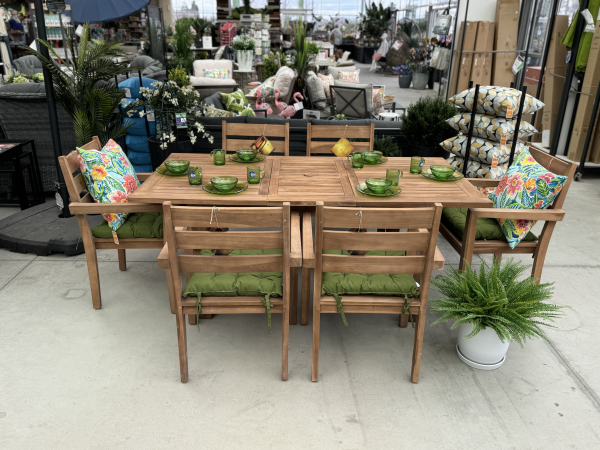 Our Austin 7pc Dining set is a classic to add to your backyard. With it’s timeless simplicity and teak wood, it’s a set that will last! This large table is extendible and allows for an umbrella if you so choose. 6 teak wood chairs are included with this set to fit the whole family!