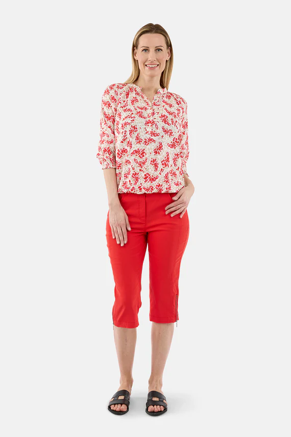 Light and feminine blouse from Brandtex, designed in a decorative graphic print in red shades on a soft sand-colored base. The lively pattern gives the blouse a fresh and modern look that can easily spice up any outfit and create an eye-catcher in your everyday wardrobe.