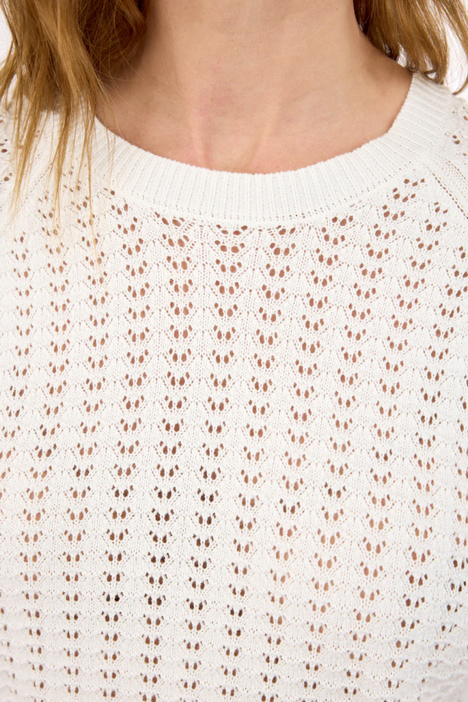 Light and feminine knitted blouse from Brandtex in a classic white color that gives a fresh and timeless look. The blouse is knitted in an airy quality with a decorative lace pattern that adds structure and a light, summery look – perfect for both spring and summer as well as mild transitional days.