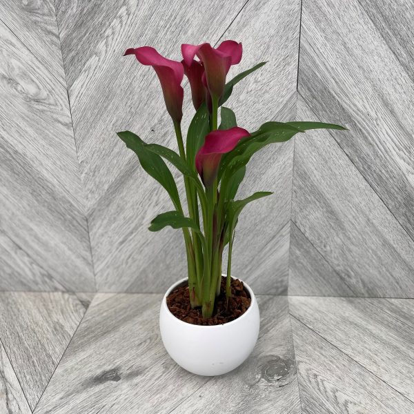 This elegant 4″ Calla Lily, beautifully arranged in a sleek ceramic pot, adds a touch of sophistication to any space. With its graceful, trumpet-shaped blooms and vibrant color, it’s a perfect addition to brighten up your home or office. The compact size makes it ideal for tabletops, desks, or shelves, bringing a subtle yet striking natural beauty wherever it’s placed. Ceramic may vary from photo.