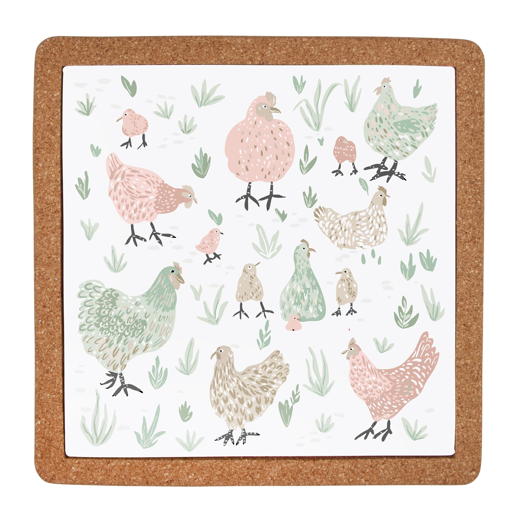 Oversized, thick cork surrounds the printed ceramic trivet. It will not slip and protect surfaces from hot & cold dishes. Coordinating items available. Wipe clean with a damp cloth.