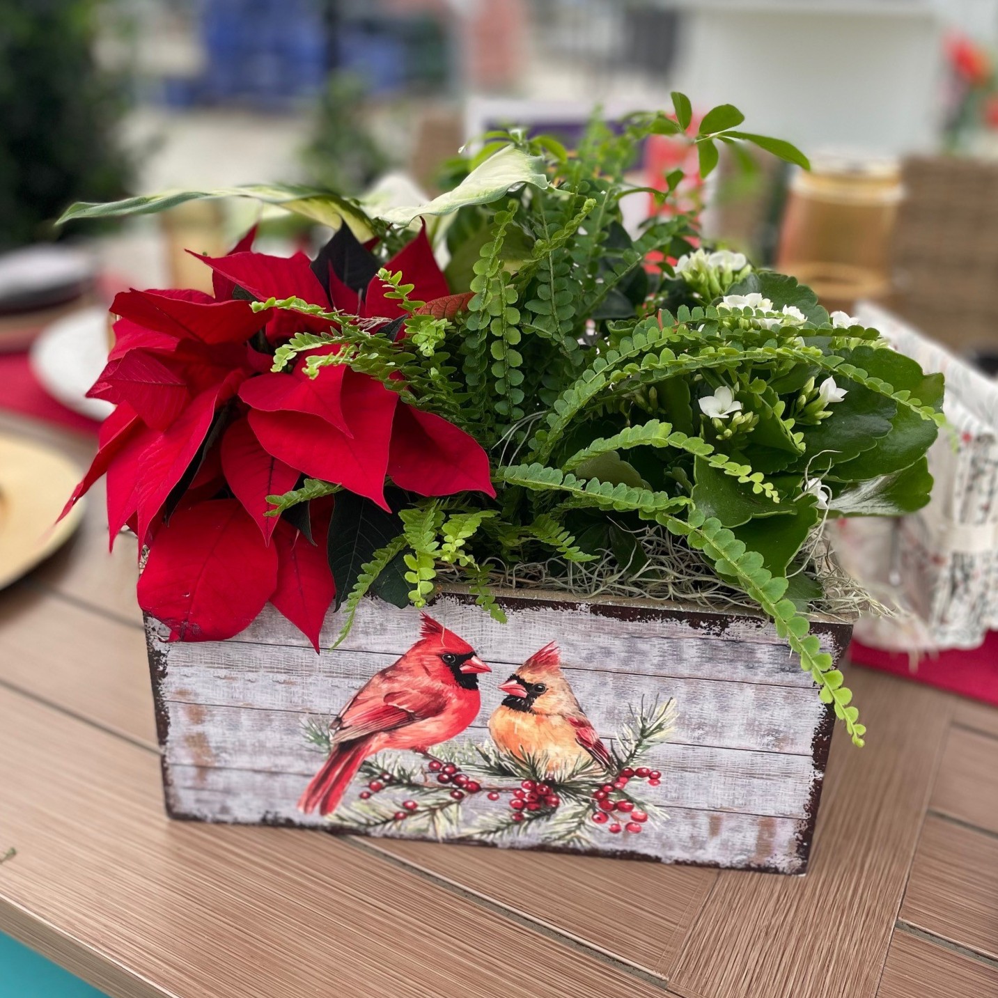 The 13″ Comet Cardinal Arrangement beautifully captures the warmth of the holiday season with lush greenery, a vibrant poinsettia, and a blooming kalanchoe in assorted colours. Presented in a rustic wooden planter featuring a charming pair of cardinals perched among winter berries, this festive display adds a natural, heartfelt touch to any décor. Perfect for use as a centerpiece, thoughtful gift, or to brighten your home throughout the Christmas season.