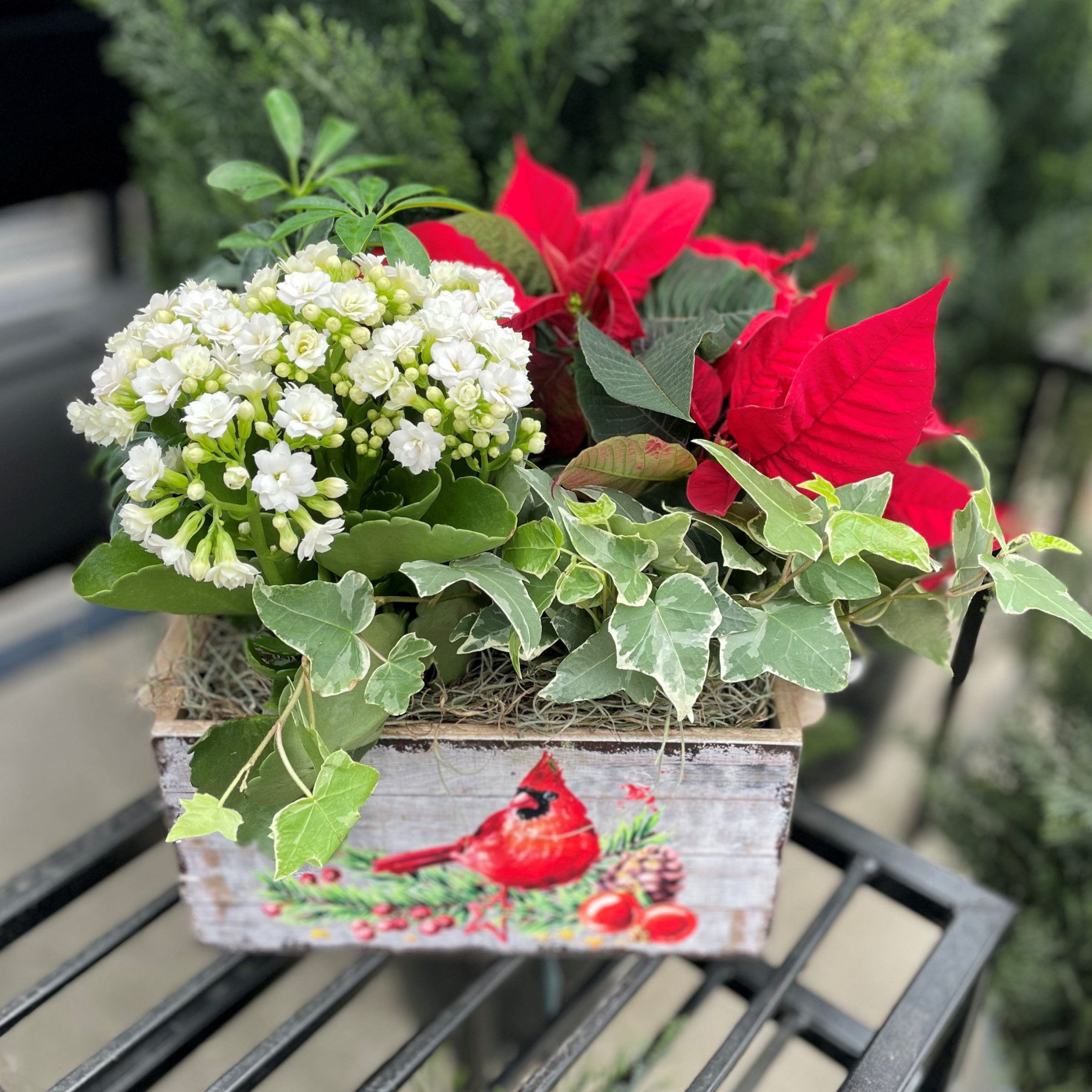 The 11″ Comet Cardinal Arrangement beautifully captures the warmth of the holiday season with lush greenery, a vibrant poinsettia, and a blooming kalanchoe in assorted colours. Presented in a rustic wooden planter featuring a charming pair of cardinals perched among winter berries, this festive display adds a natural, heartfelt touch to any décor. Perfect for use as a centerpiece, thoughtful gift, or to brighten your home throughout the Christmas season.