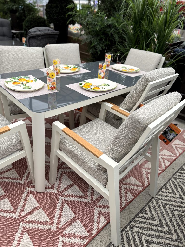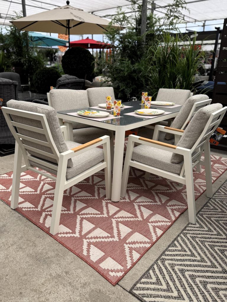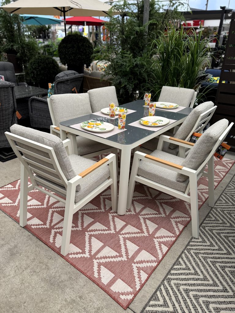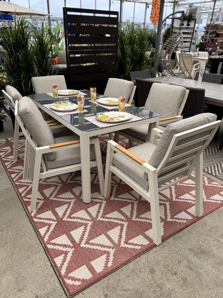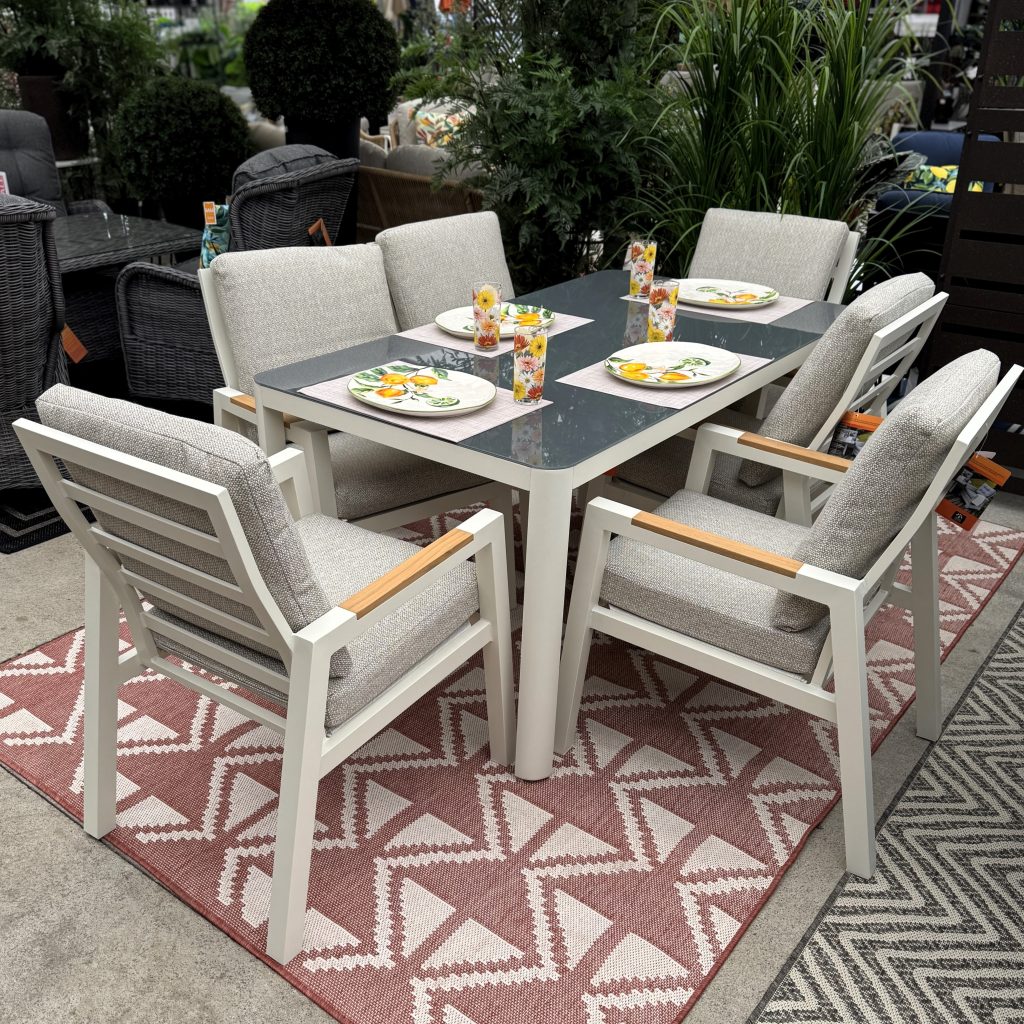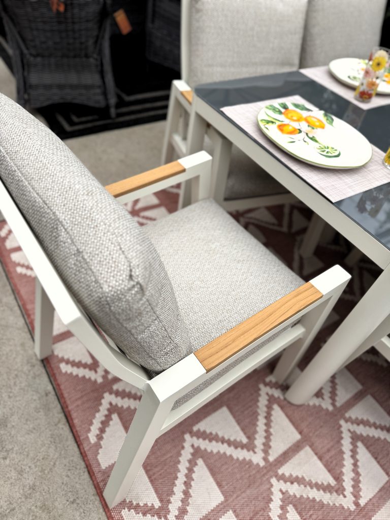 This 7pc dining set brings a classic appeal to any outdoor space. This set seats 6 very comfortably with a generous size table. The set is constructed with a cream colour coated aluminum framing. The wide, comfortable chairs feature beautiful teak arms. This set is perfect for relaxed dining and entertaining. The cushions are all weather in a classic beige colour. The sand ceramic table top is the perfect setting for your next outdoor dining adventure.