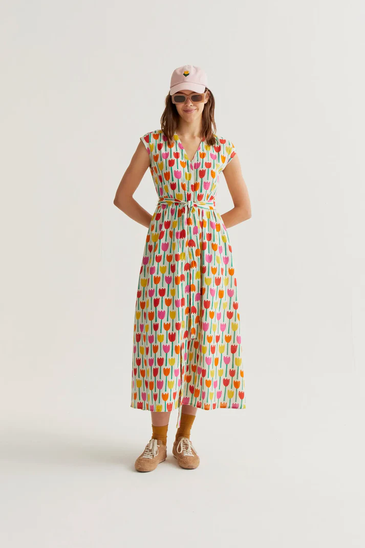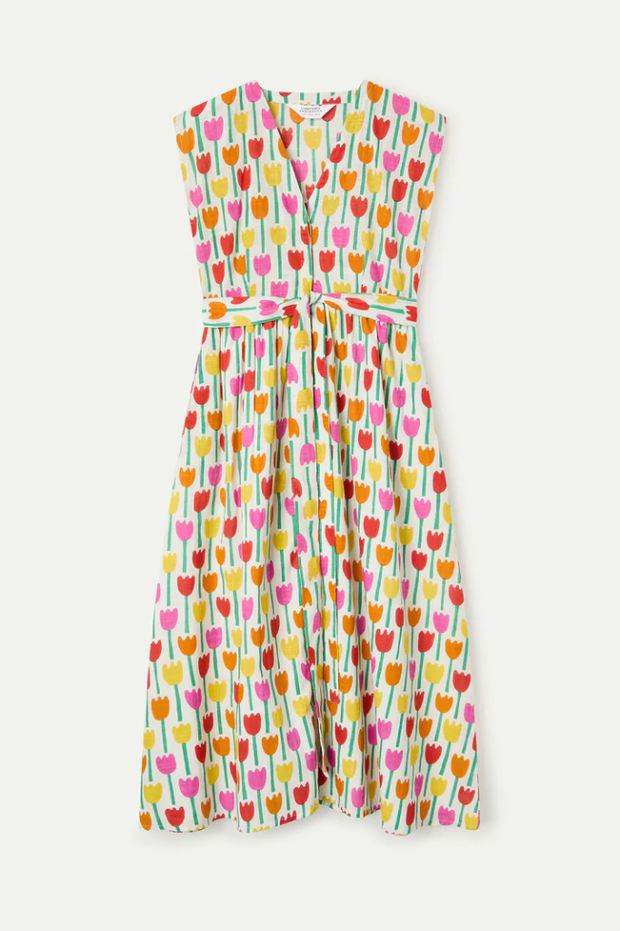 Long dress in 100% cotton with a tulip print. V-neck and sleeveless. Front closure with concealed buttons and a tie waist. Fully lined