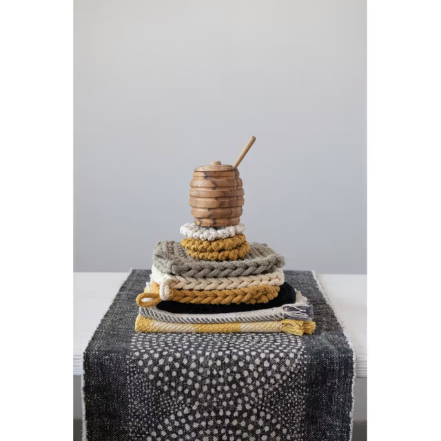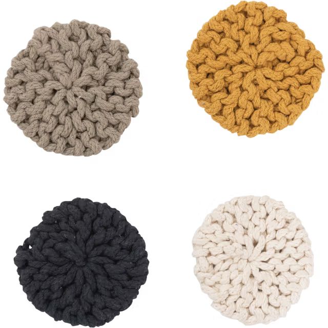Protect your surfaces in style with these beautifully handwoven cotton coasters. Designed with a thick, textured knit, these round coasters add a cozy, modern touch to any table while keeping it safe from heat, moisture, and scratches.