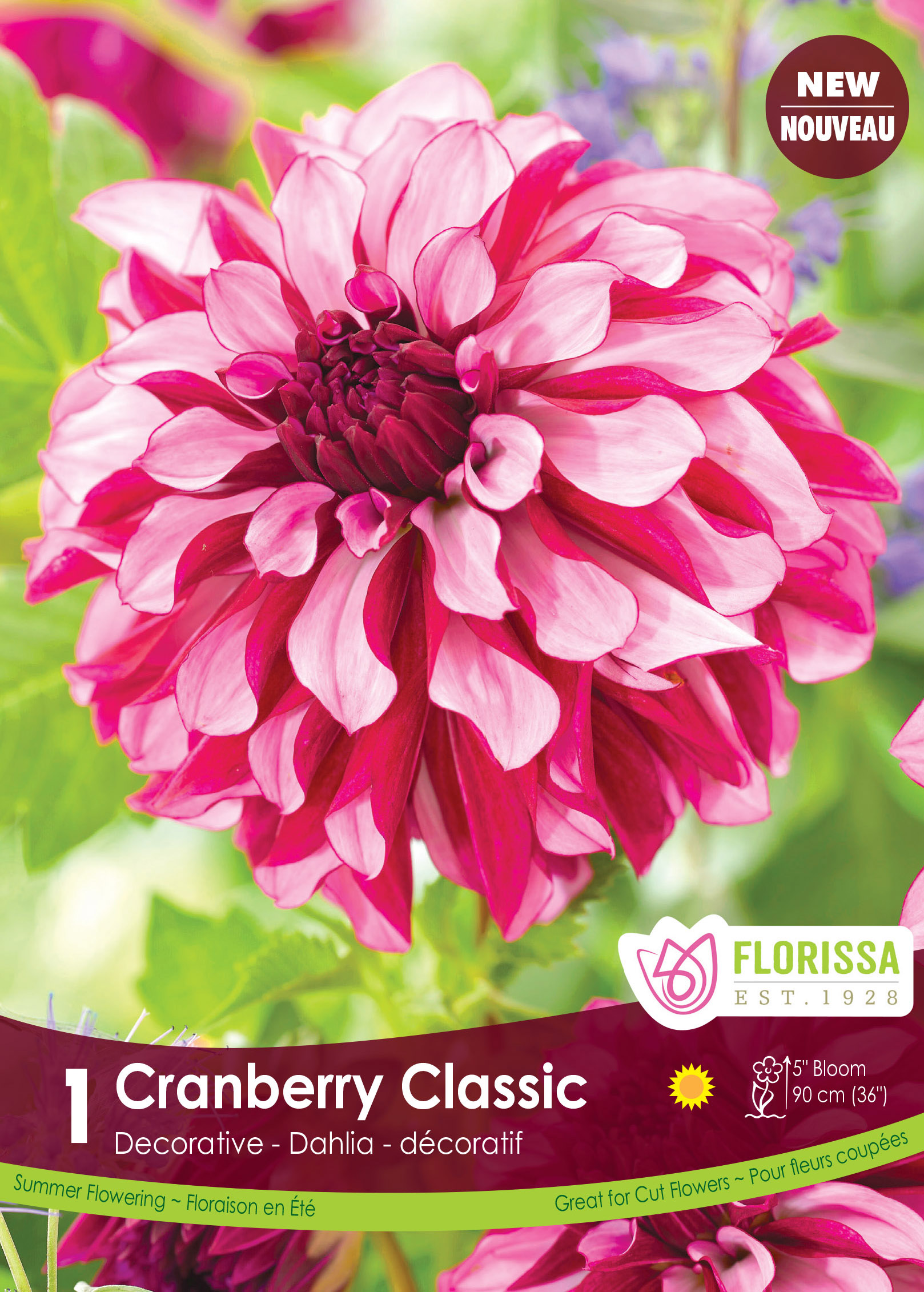 Dahlias are extremely showy in the garden and make for great cutflowers. Cranberry Classic is a decorative dahlia with unique 5″ blooms with petals that are dark pink on the underside and a contrasting paler pink facing upward and a deep pink centre. Grows 35″ high