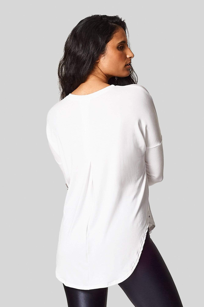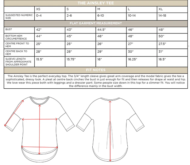 If you’re looking for a cute top with a little more coverage, the Ainsley is for you. Fitted through the neck and shoulders, with drape around the waist and a scoop hem. The length sits low on the hip, and a pleat at the back gives flattering volume. The Ainsley Tee is constructed from a modal/spandex blend to help keep it’s shape.