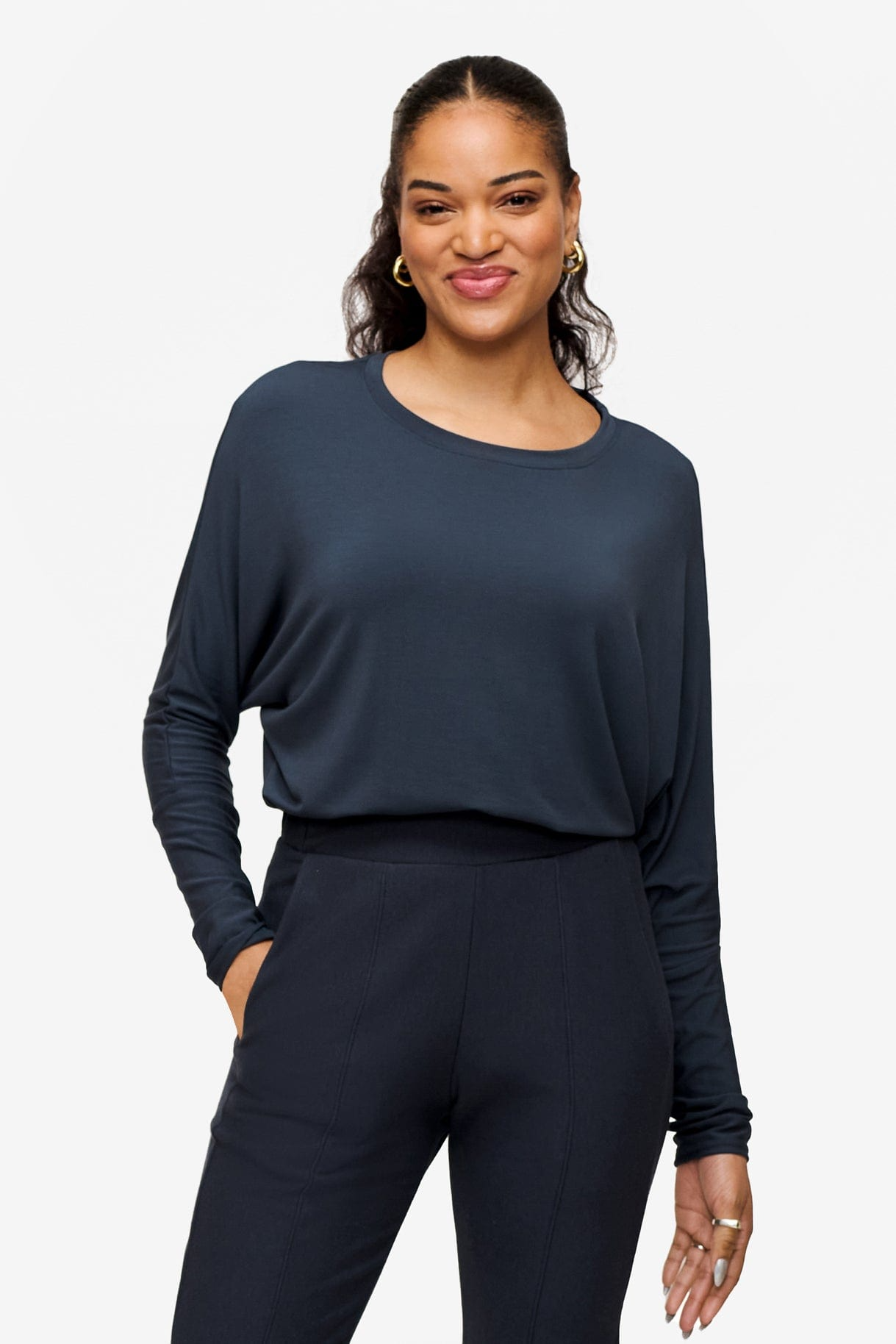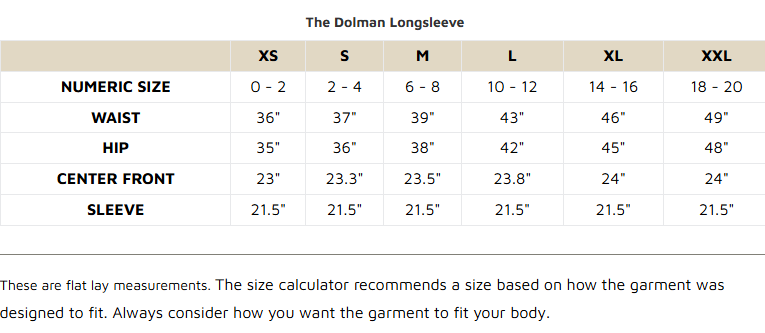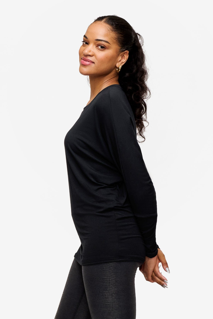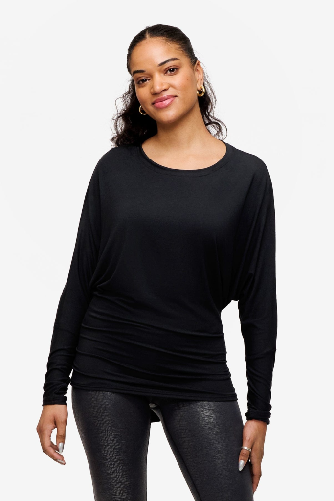 The standout feature of this tee is its dolman sleeves, offering a relaxed fit that drapes beautifully and loose under the arms. The fitted sleeve & hip balances out the drape of the bust area.