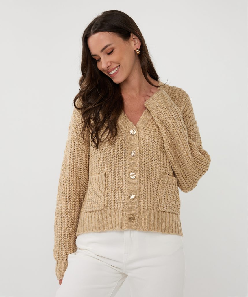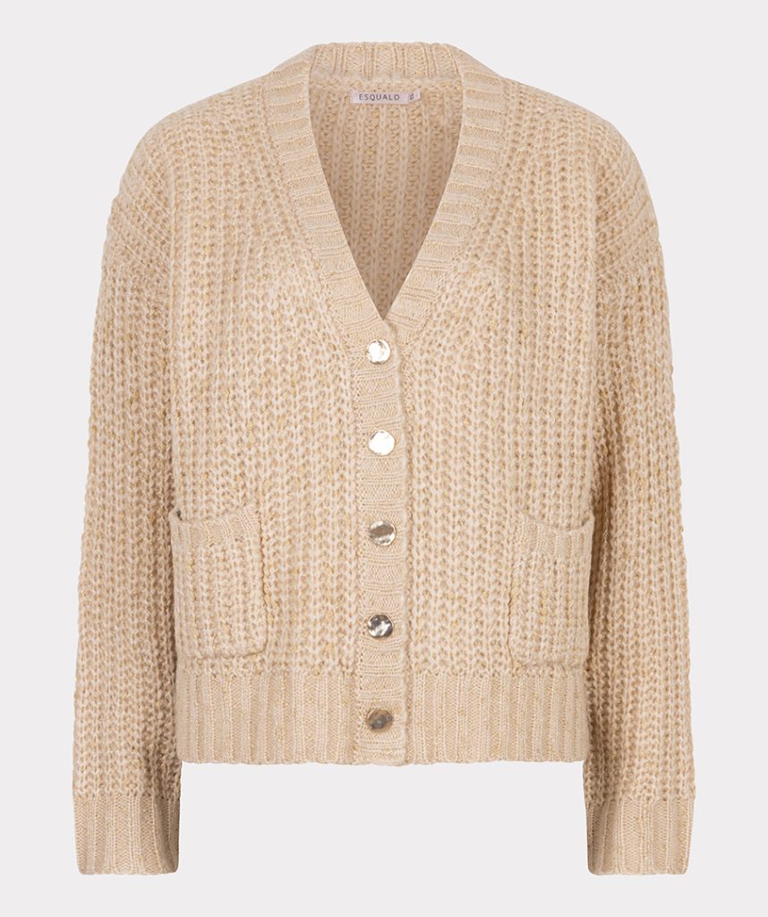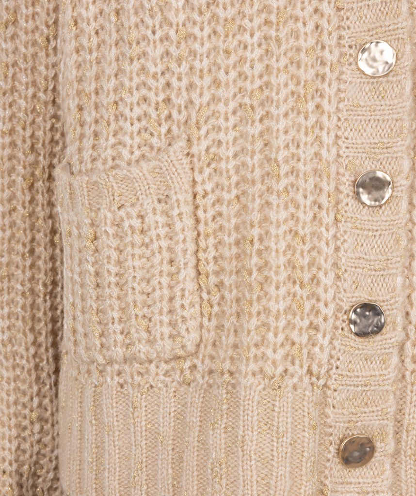 Relax fit Button front V-neck with Patch pockets & Drop shoulder long sleeves, shimmers with Lurex threads woven throughout