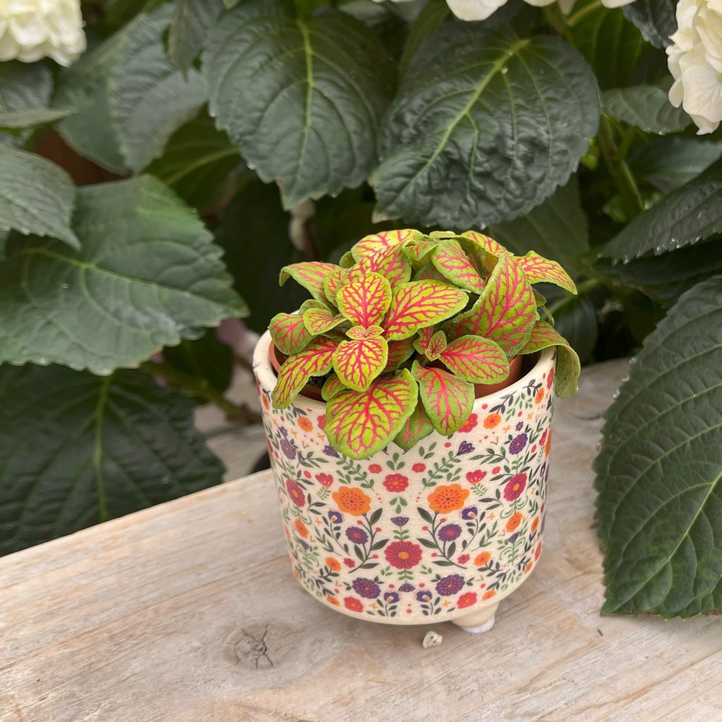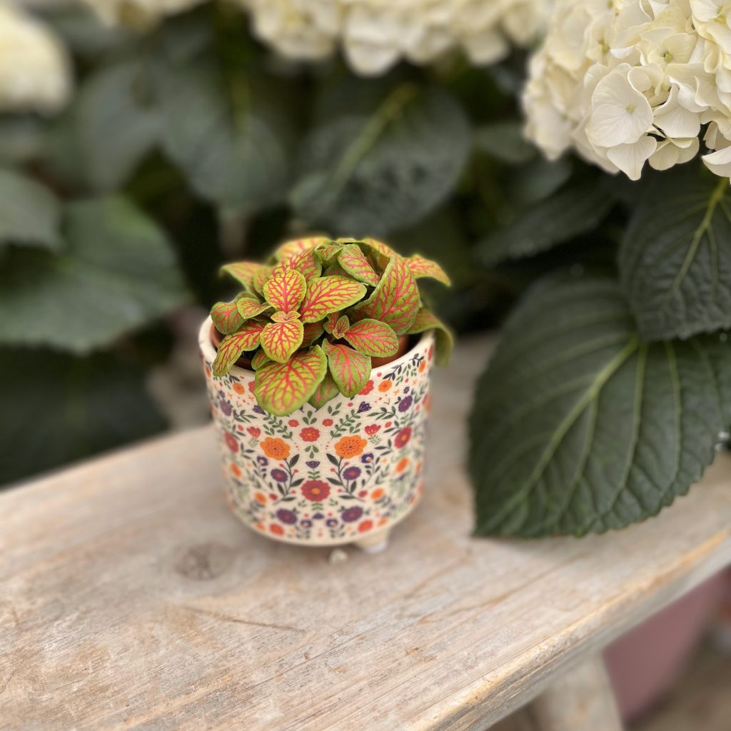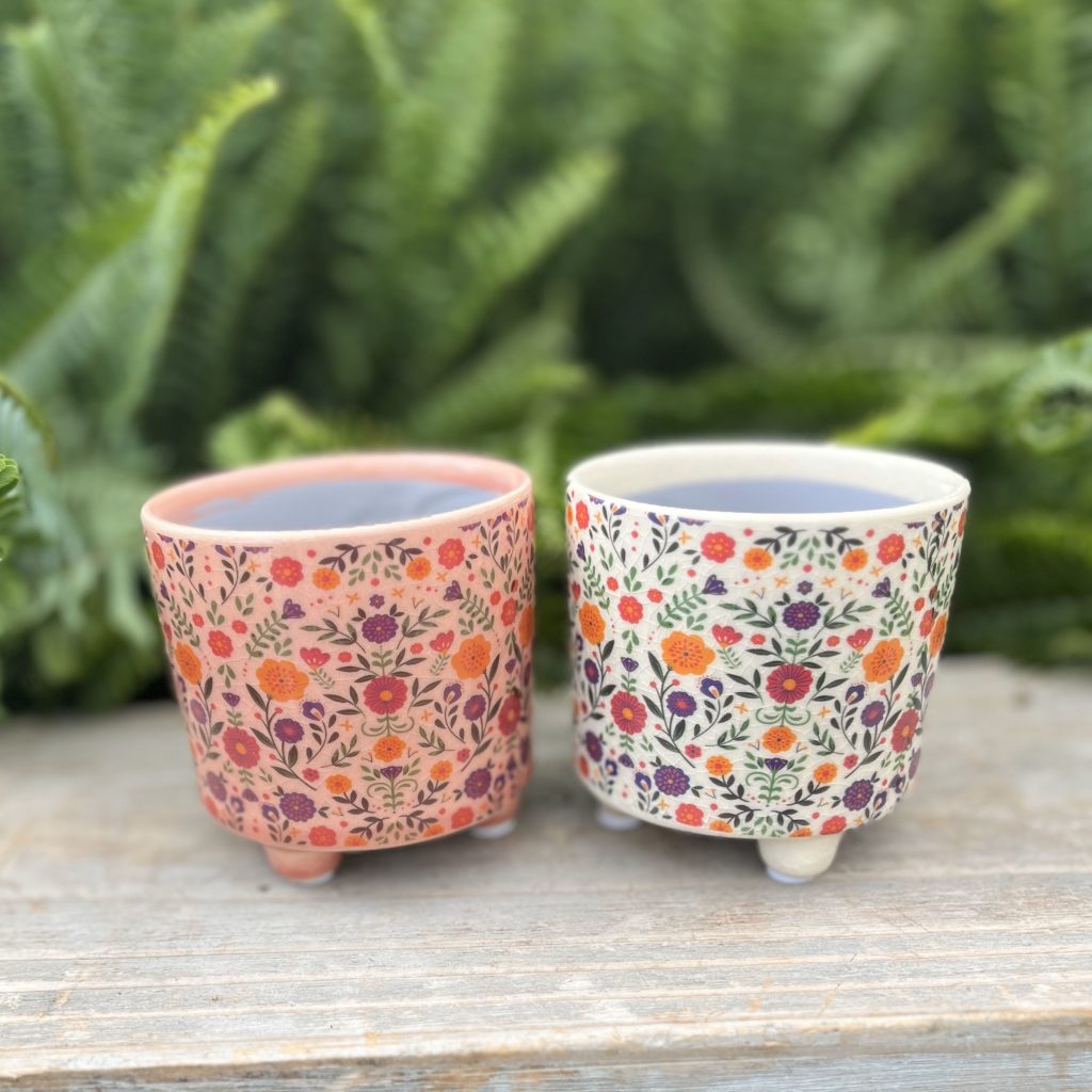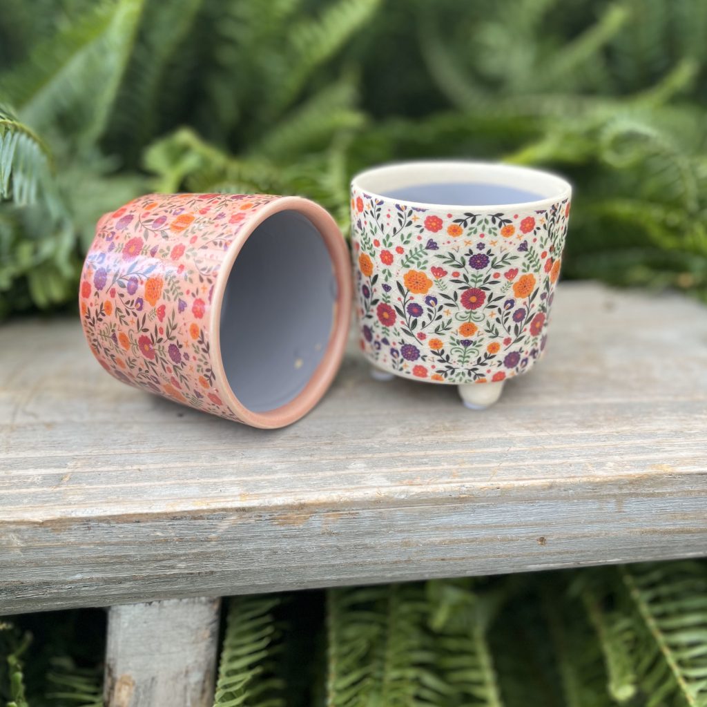 These charming 3-inch plant pots bring a burst of color and whimsy to any space with their intricate floral patterns. Set on three petite feet, they feature delicate orange, pink, and purple blooms against two different backdrops—one in a warm blush pink and the other in a soft cream. Perfect for succulents or tiny houseplants, these pots add a cheerful, handcrafted touch to your windowsill, desk, or garden nook. Their playful yet elegant design makes them ideal for gifting or brightening up your own plant collection.