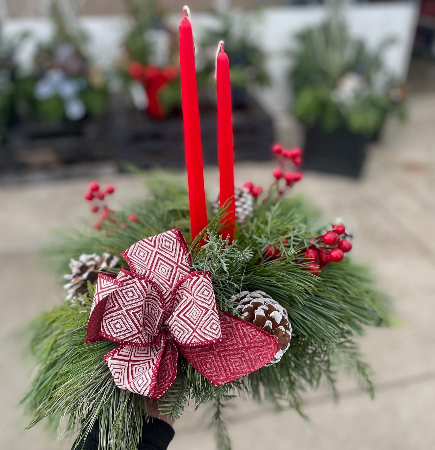 This beautiful large holiday centerpiece is made with an abundant mix of fresh seasonal greens, creating a full and festive display. Featuring two classic taper candles, frosted pinecones, bright berries, and a decorative bow, it brings a warm and elegant touch to any table or holiday gathering. Bow style may vary, making each arrangement uniquely charming.