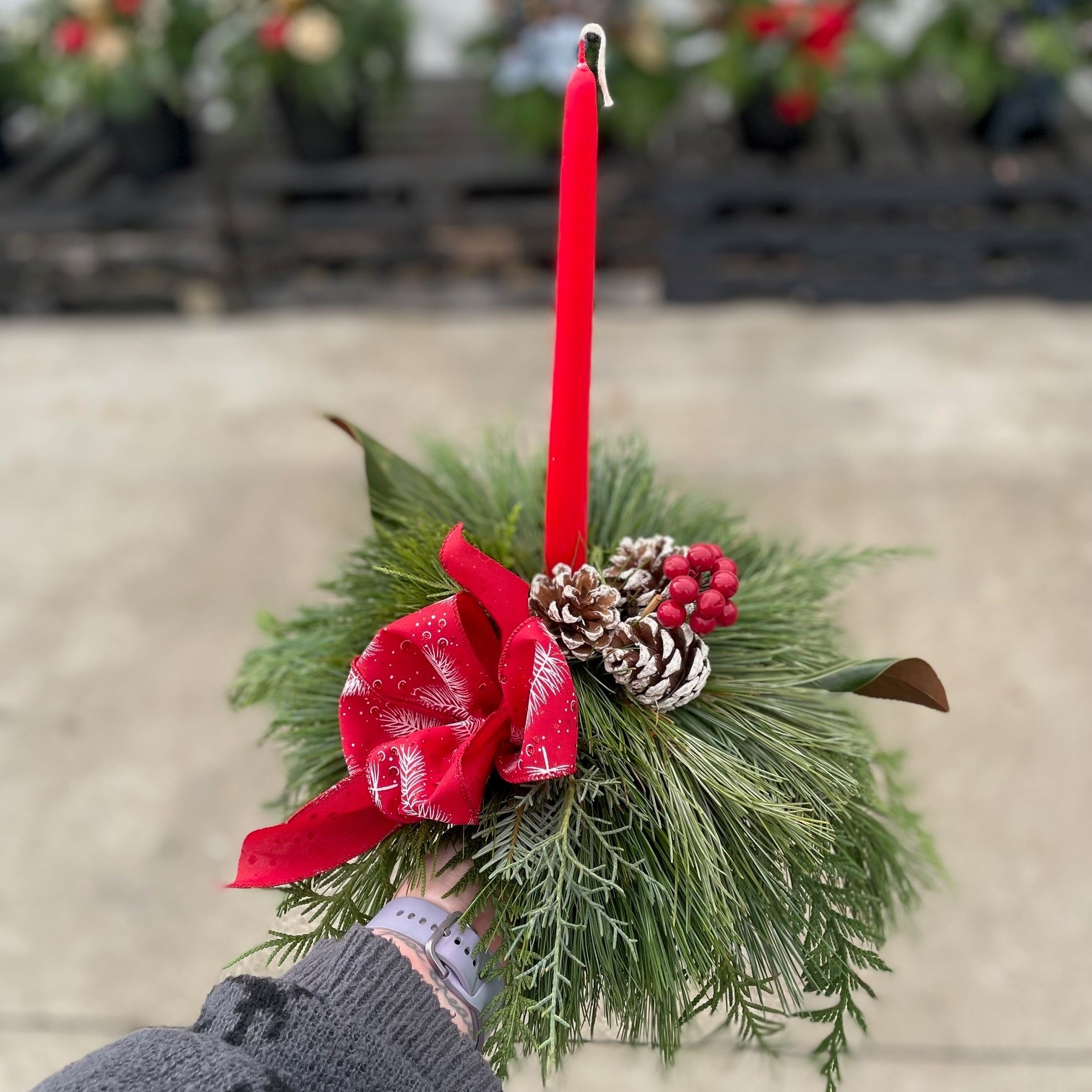 This charming holiday centerpiece is crafted with a lush mix of fresh seasonal greens and topped with a classic taper candle for a warm, festive touch. Accented with pinecones, berries, and a decorative bow, it’s perfect for adding holiday cheer to your table, mantle, or entryway. Bow style may vary based on availability, making each piece uniquely beautiful.