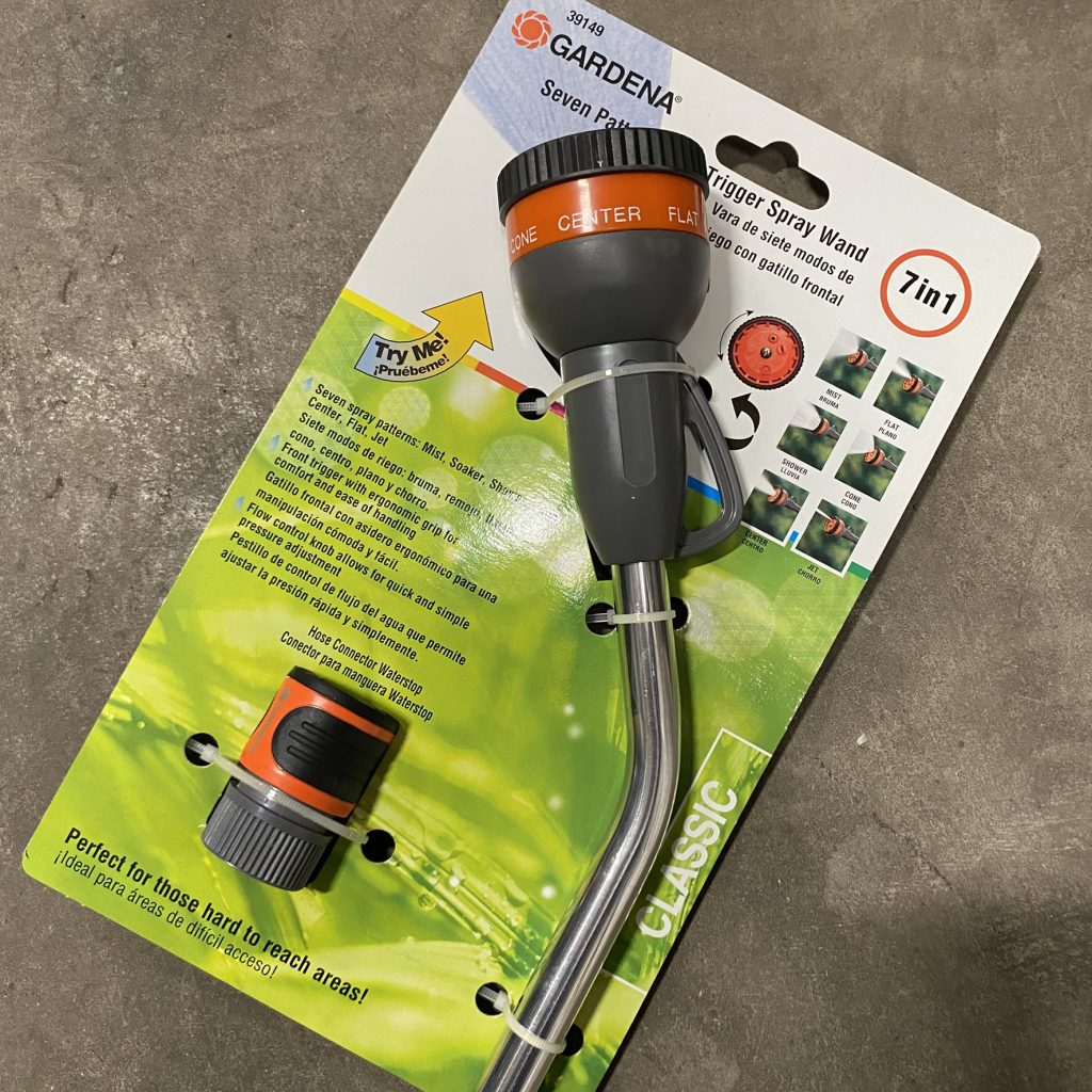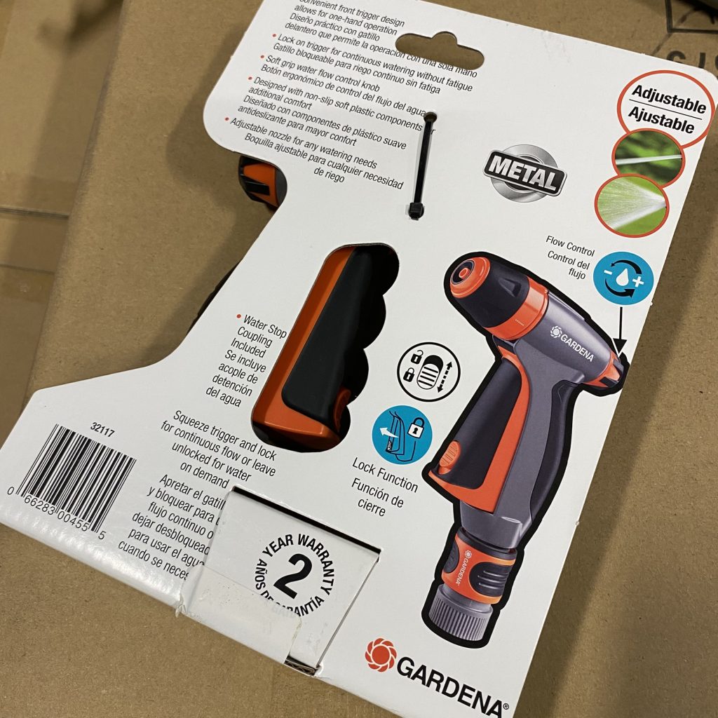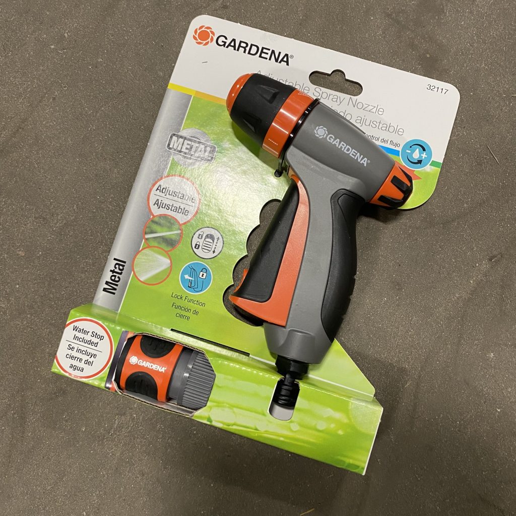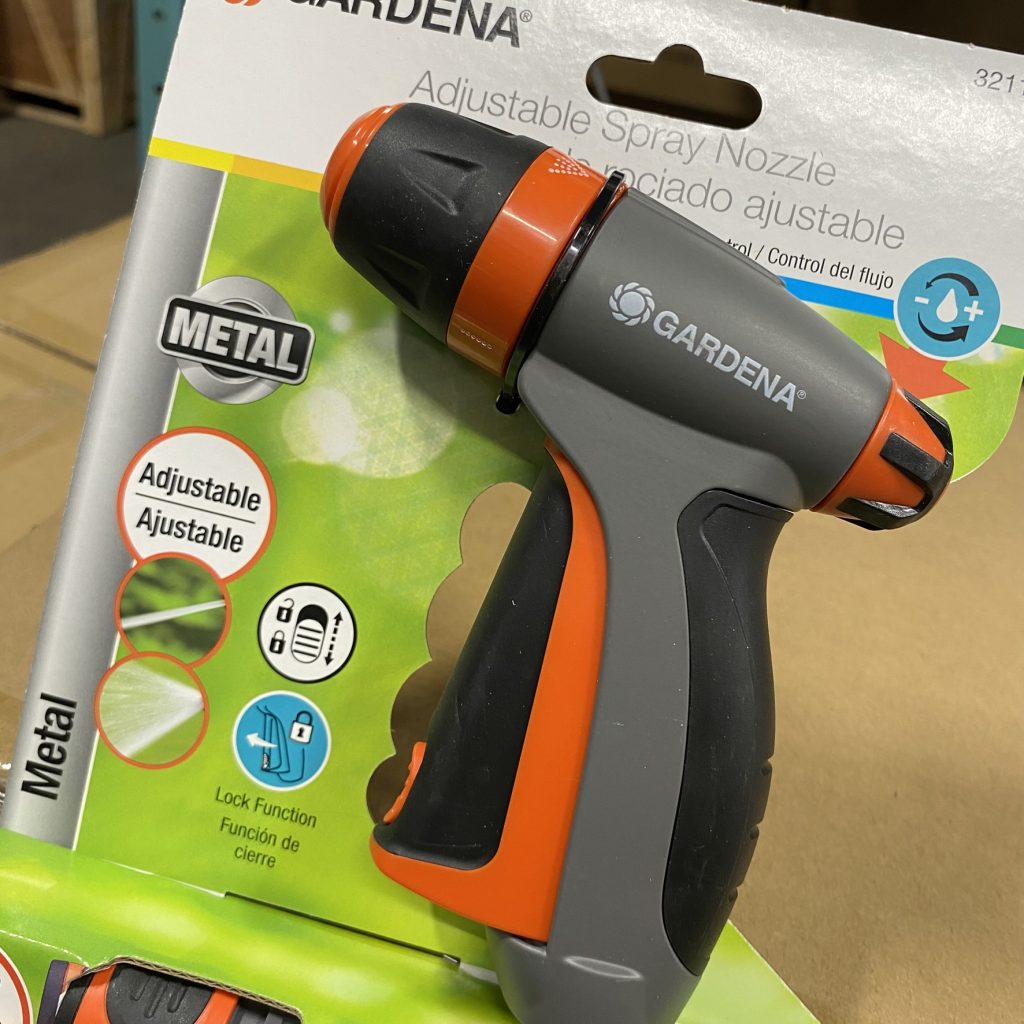 This Gardena adjustable spray pistol nozzle has a convenient front trigger design allowing for one hand operation with adjustable push button on off control. Lock on trigger for continuous watering without fatigue.