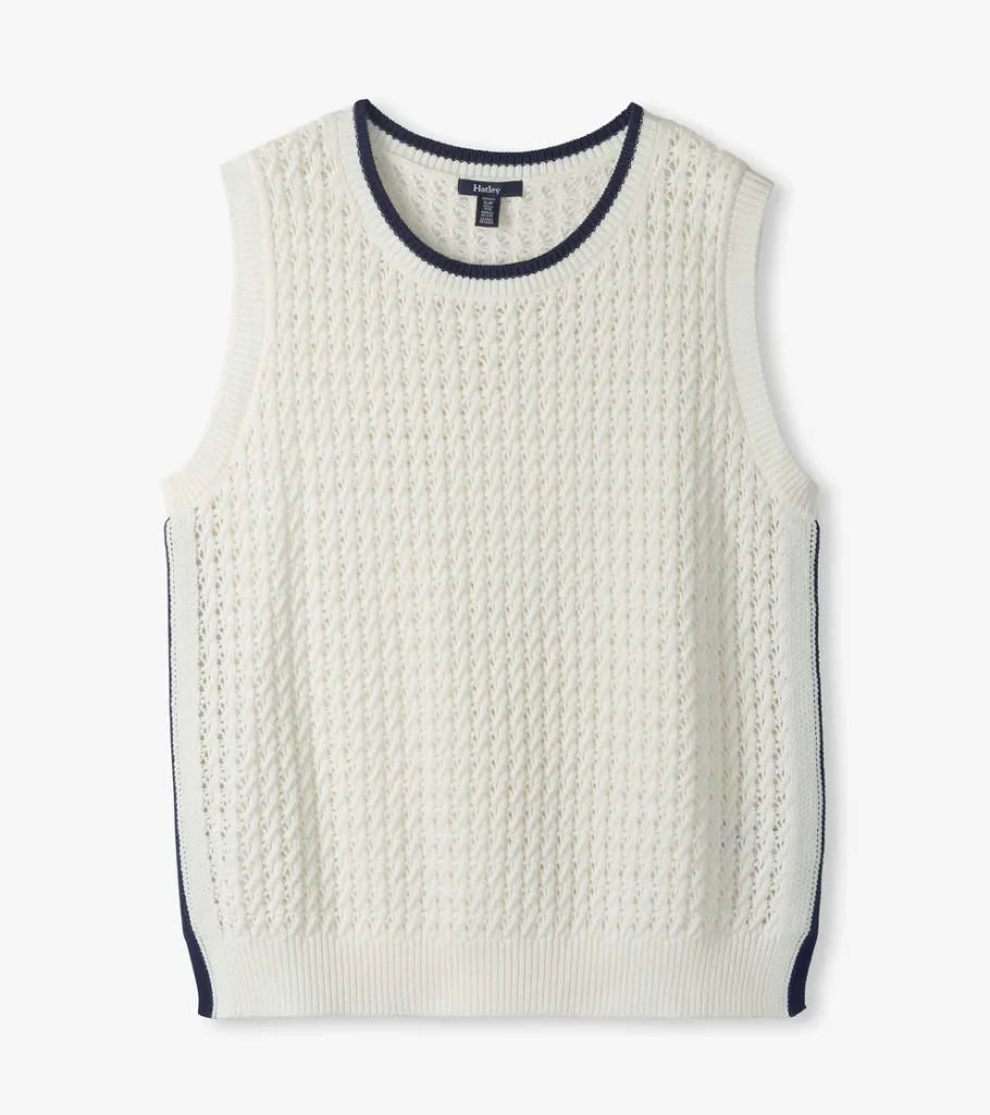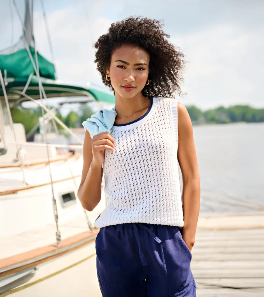 Light and breathable, this sleeveless knit tank is crafted from soft cotton with a textured feel and decorative openwork details for added dimension. Horizontal stripes in soft hues of cream, blue, aqua, and blush sit over a neutral base, creating a gentle, airy palette. Designed with a classic crew neck and ribbed trim at the neck, armholes, and hem, it’s perfect on its own or layered over long sleeves on cooler transitional days. An easy-to-layer piece made for relaxed versatility.
