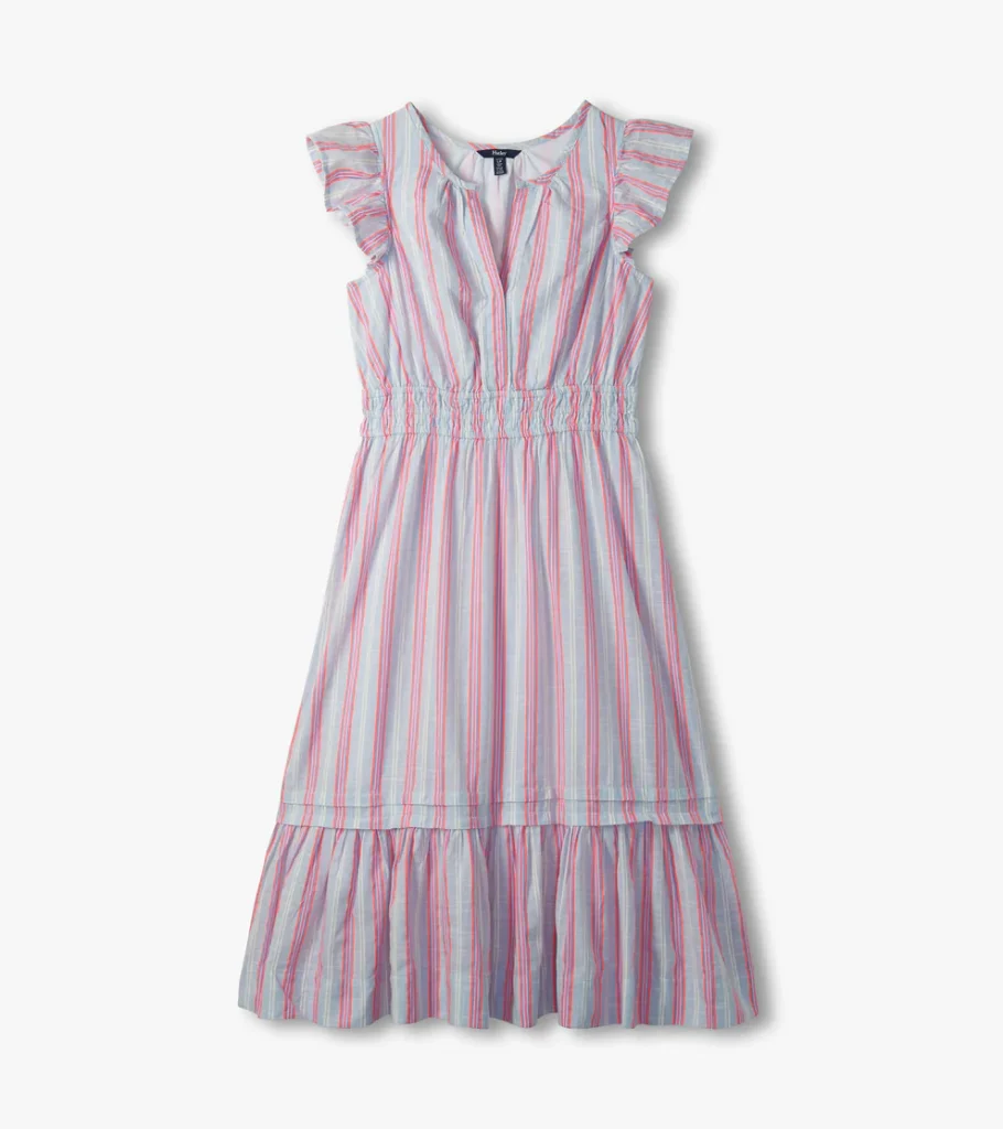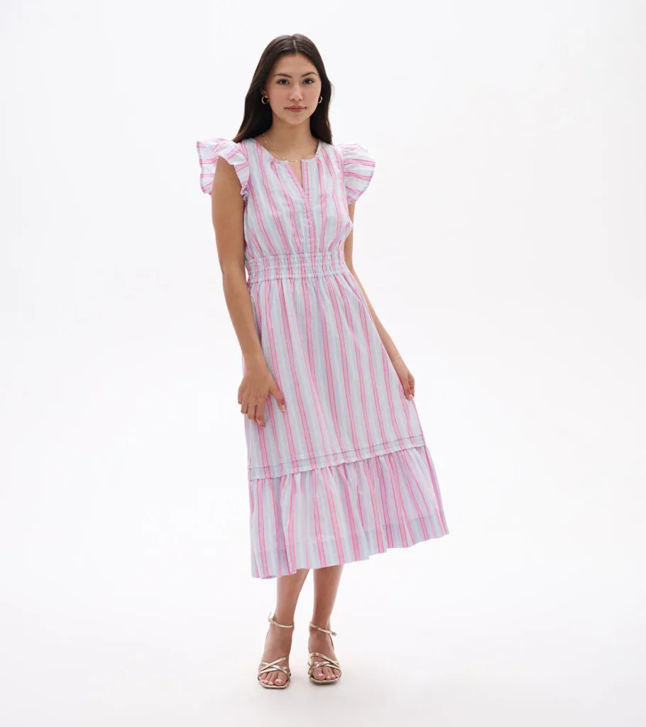This lightweight, airy midi dress is crafted from a semi-sheer woven cotton-polyester blend with full lining for easy wear. Vertical stripes in neon pink, neon coral, blue, and white play against a heathered pale blue background, creating a fresh mix of bold and soft tones. Designed with flutter sleeves, a V-neckline with subtle notch, and a tiered skirt, it offers a breezy silhouette with an elastic waist for relaxed shape.