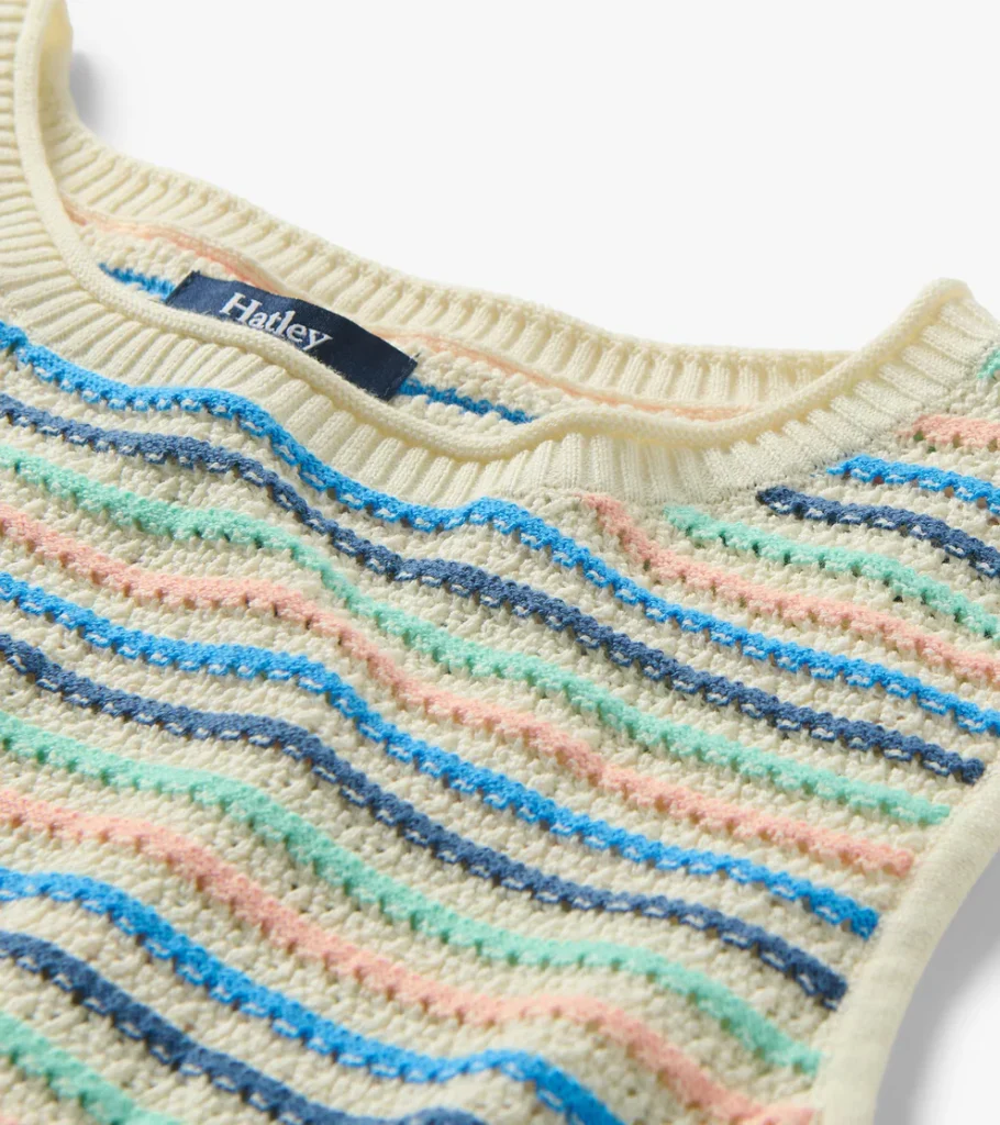 Light and breathable, this sleeveless knit tank is crafted from soft cotton with a textured feel and decorative openwork details for added dimension. Horizontal stripes in soft hues of cream, blue, aqua, and blush sit over a neutral base, creating a gentle, airy palette. Designed with a classic crew neck and ribbed trim at the neck, armholes, and hem, it’s perfect on its own or layered over long sleeves on cooler transitional days. An easy-to-layer piece made for relaxed versatility.