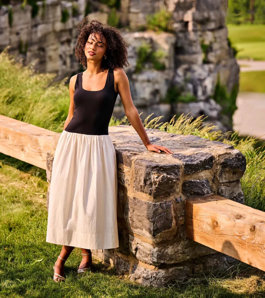 Light and easy with a soft contrast, this sleeveless mixed media midi dress pairs a fitted patriot blue double-layer jersey bodice with a lightly gathered cream skirt that falls to mid-calf. The scooped neckline and slender shoulder straps add a clean finish, while convenient side pockets bring casual function. Airy and versatile, it’s a throw-on piece made for warm days and relaxed moments.