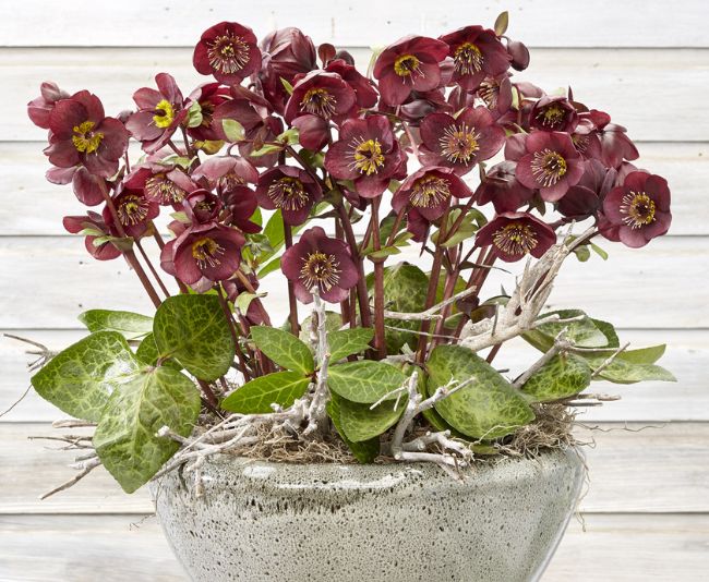 The Lenten Rose is an easy spring blooming perennial for the shady woodland garden. Plants produce bushy clumps of thick, leathery evergreen leaves. Flower stalks appear in early spring, bearing showy cup-shaped blooms. This strain features single blooms in deep burgundy-red on red stems. The leaves are marbled and have a pink tinge to the marbling as they emerge. Site these where they will stay for many years, since the plants resent being disturbed. Trim the old leaves to the ground in late winter before the buds emerge, to allow the flowers maximum impact.