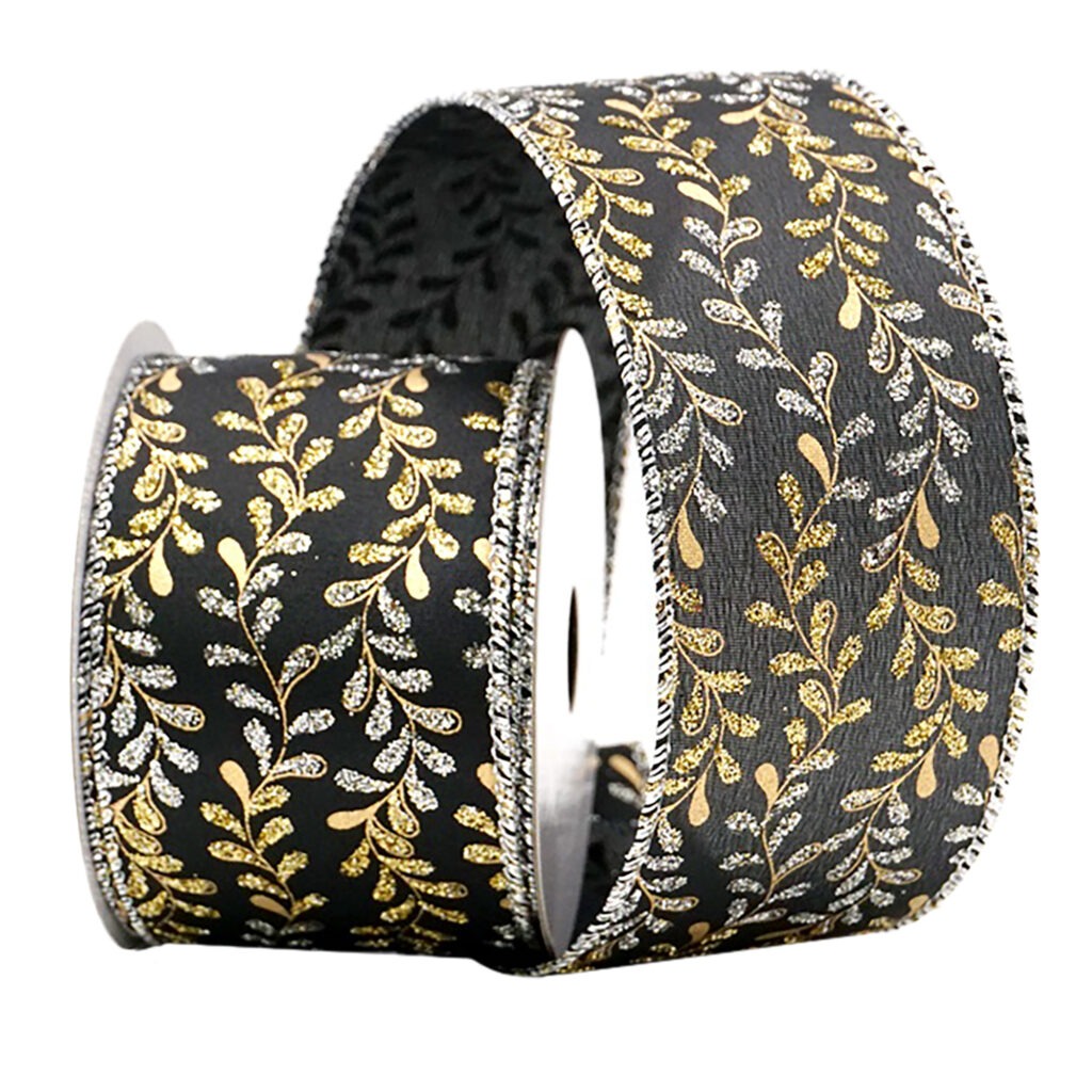 Holiday Decor – Wired Ribbon 2.5″X10 Yds. Black W/ Gold/Silver Floral Leaf Vines