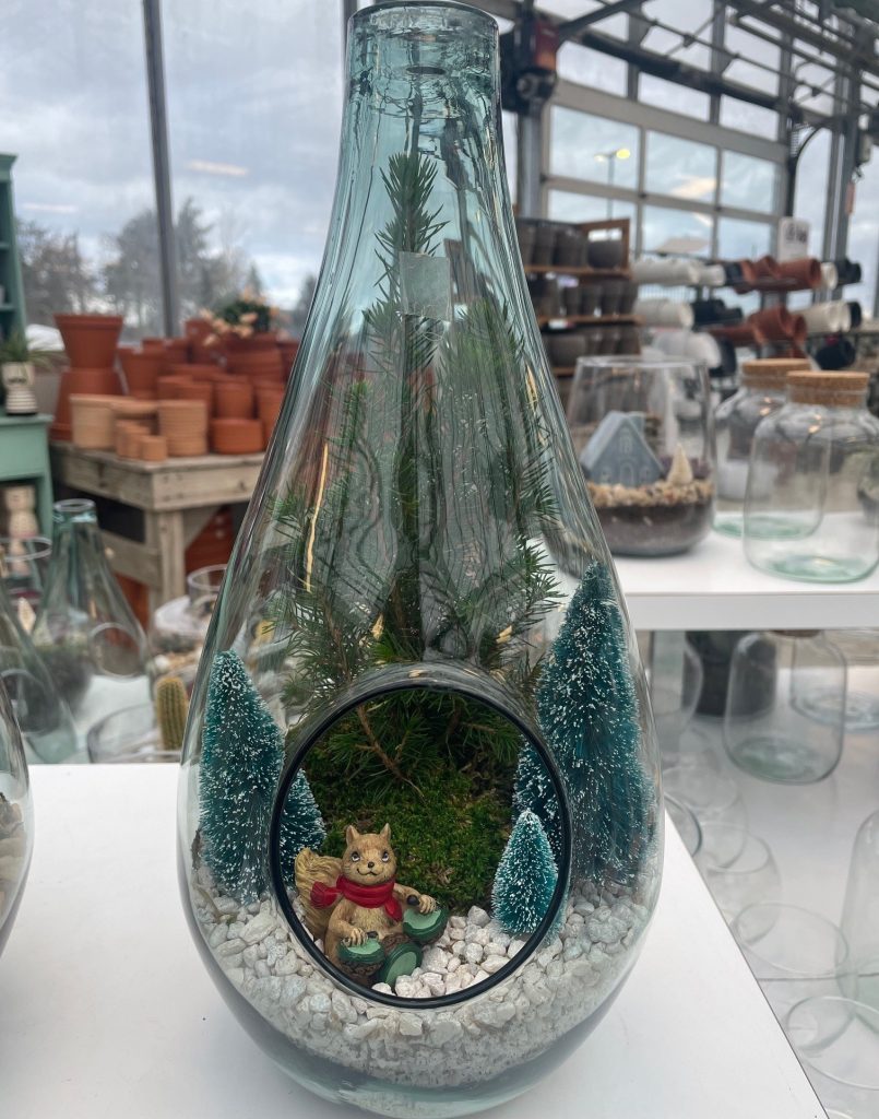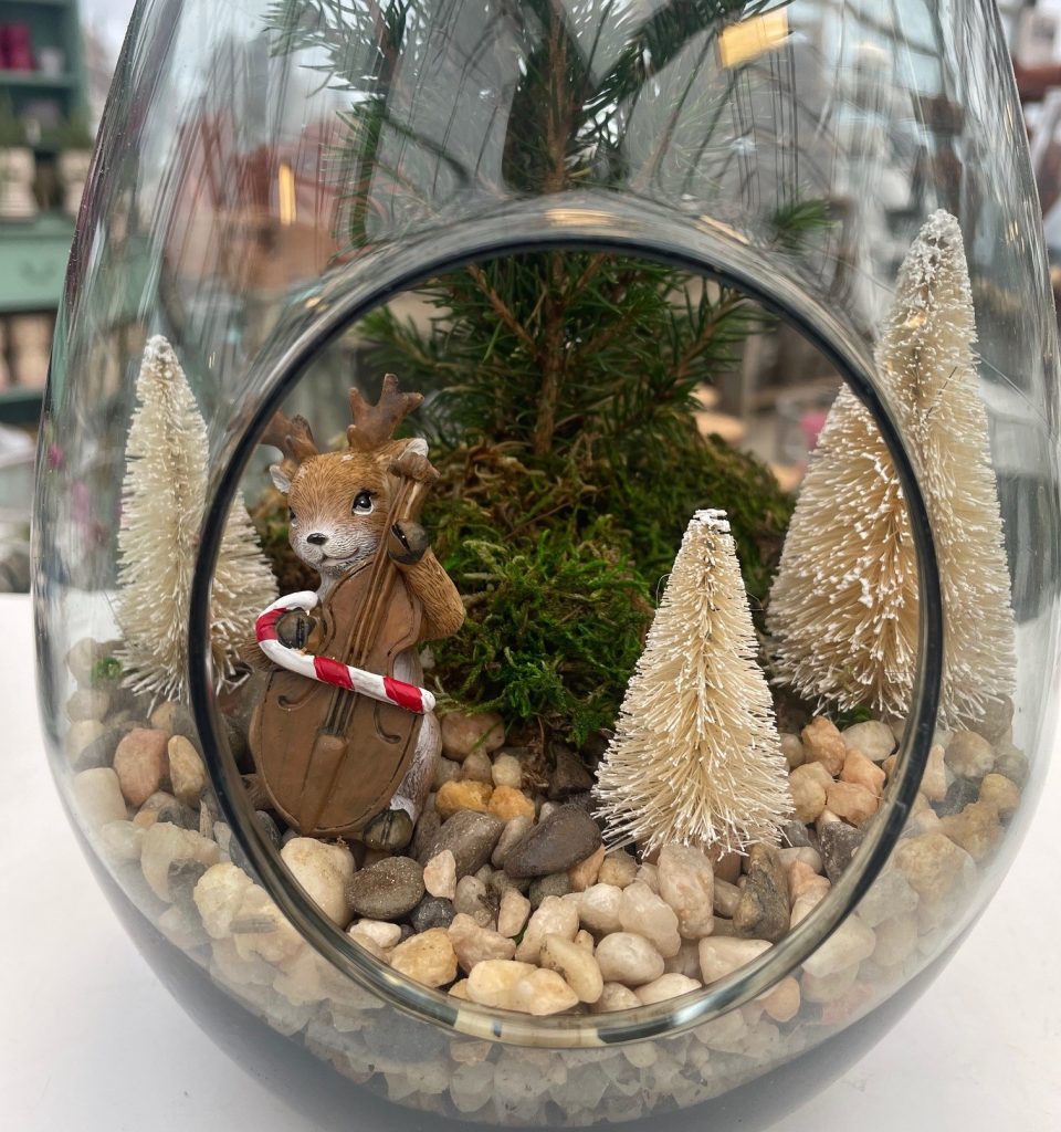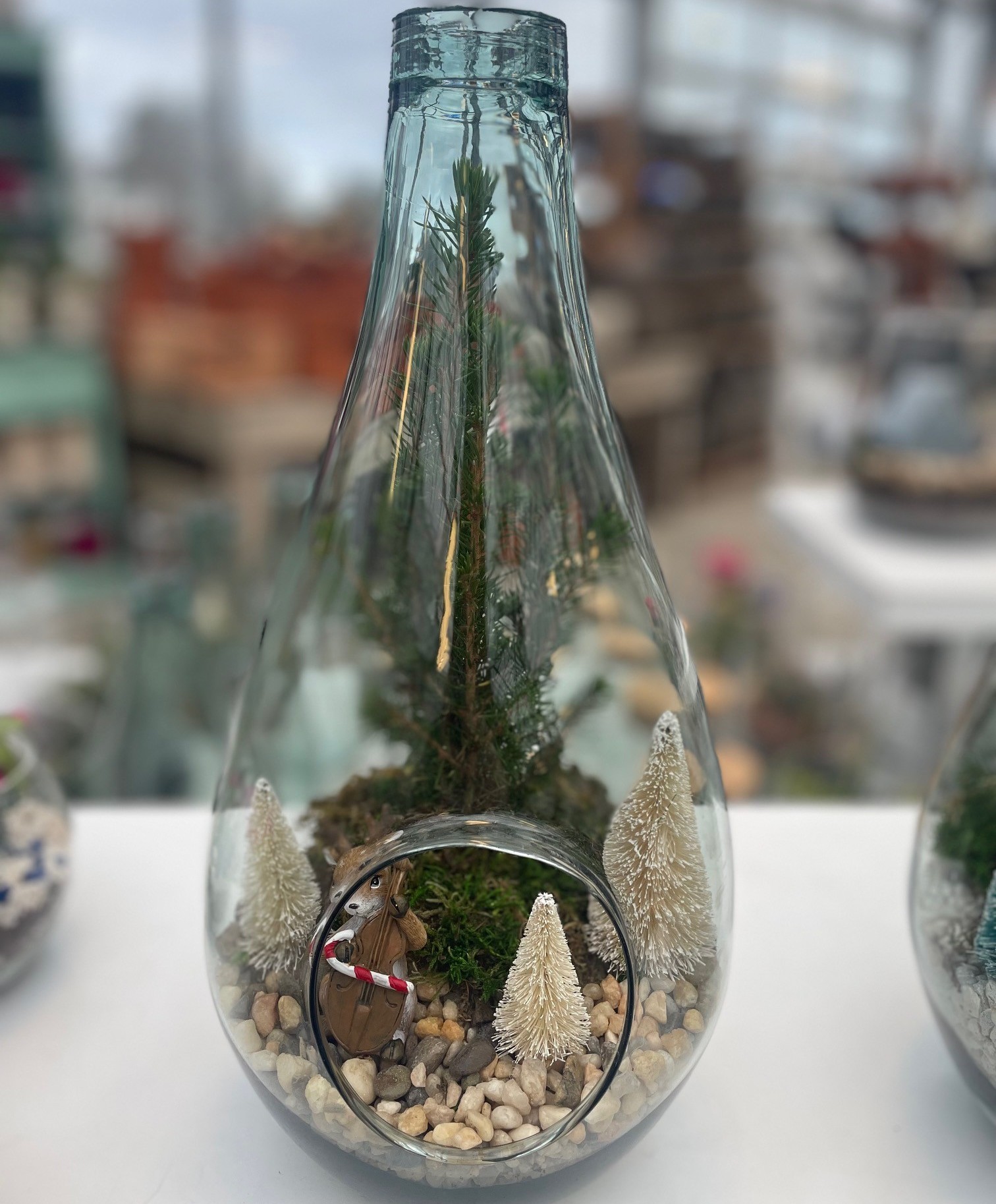 Bring whimsical winter charm into your home with these enchanting holiday terrariums, each featuring an adorable woodland animal nestled inside a glass teardrop vessel. Every piece includes festive elements such as mini evergreens, soft moss, decorative stones, and bottle-brush trees, creating a cozy forest scene. Each terrarium showcases a different holiday-themed animal character—styles vary based on availability—making every one a unique little world of seasonal magic. Perfect for gifting, decorating, or adding a touch of storybook charm to any space.