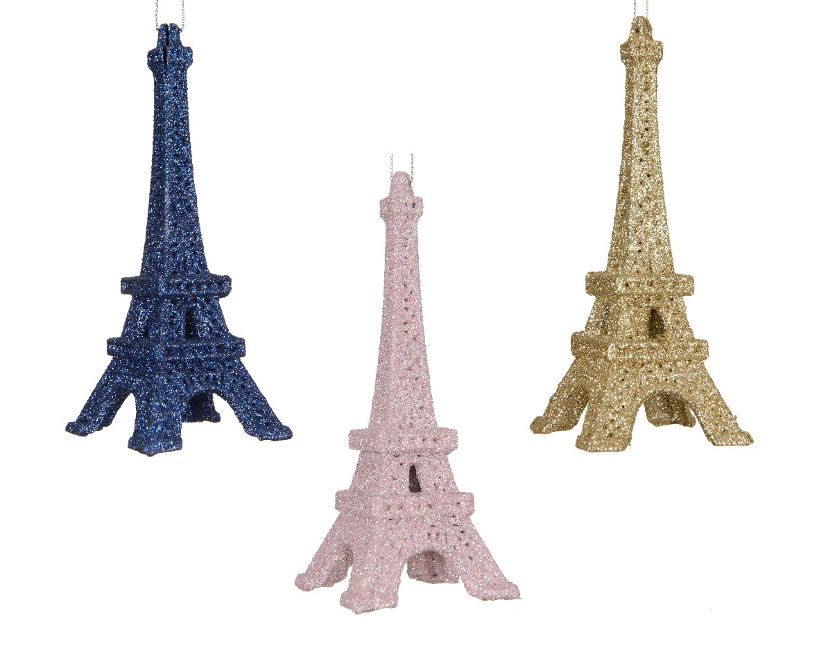 Eiffel tower ornament in pink, blue, and gold