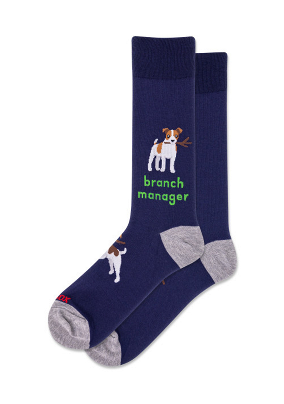 Meet the only Branch Manager you’ll actually want to report to. Stick in mouth, tail up, and ready to lead with enthusiasm and zero qualifications. These navy with grey heel & toe socks bring the charm with every step—complete with bold lettering, a very good boy, and just enough authority to run the whole park.