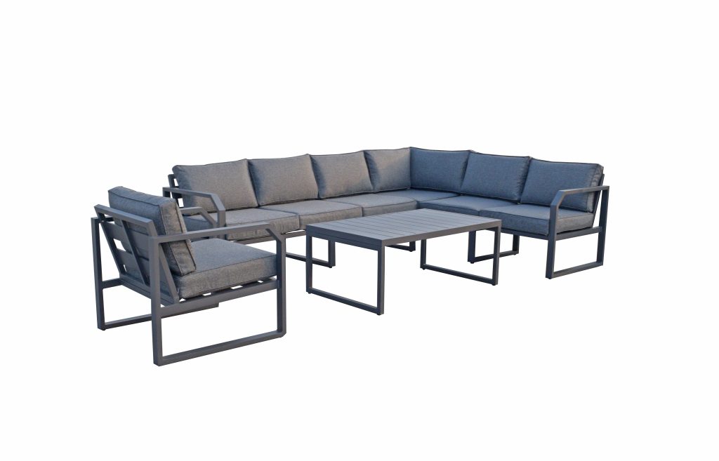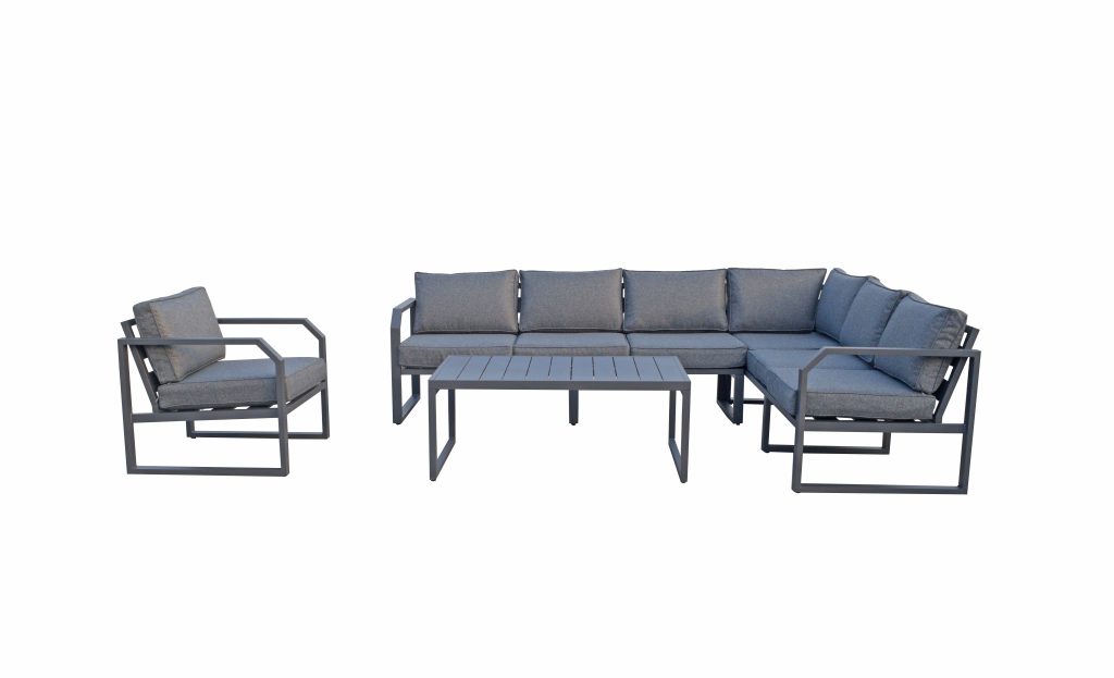 Designed for laid-back living — the Isla Corner Sectional Set a modern outdoor lounge set featuring an L-shaped sectional, matching club chair and sleek coffee table. Durable, clean-lined frame with plush all-weather cushions creates roomy, comfy seating for relaxing and entertaining in style.
