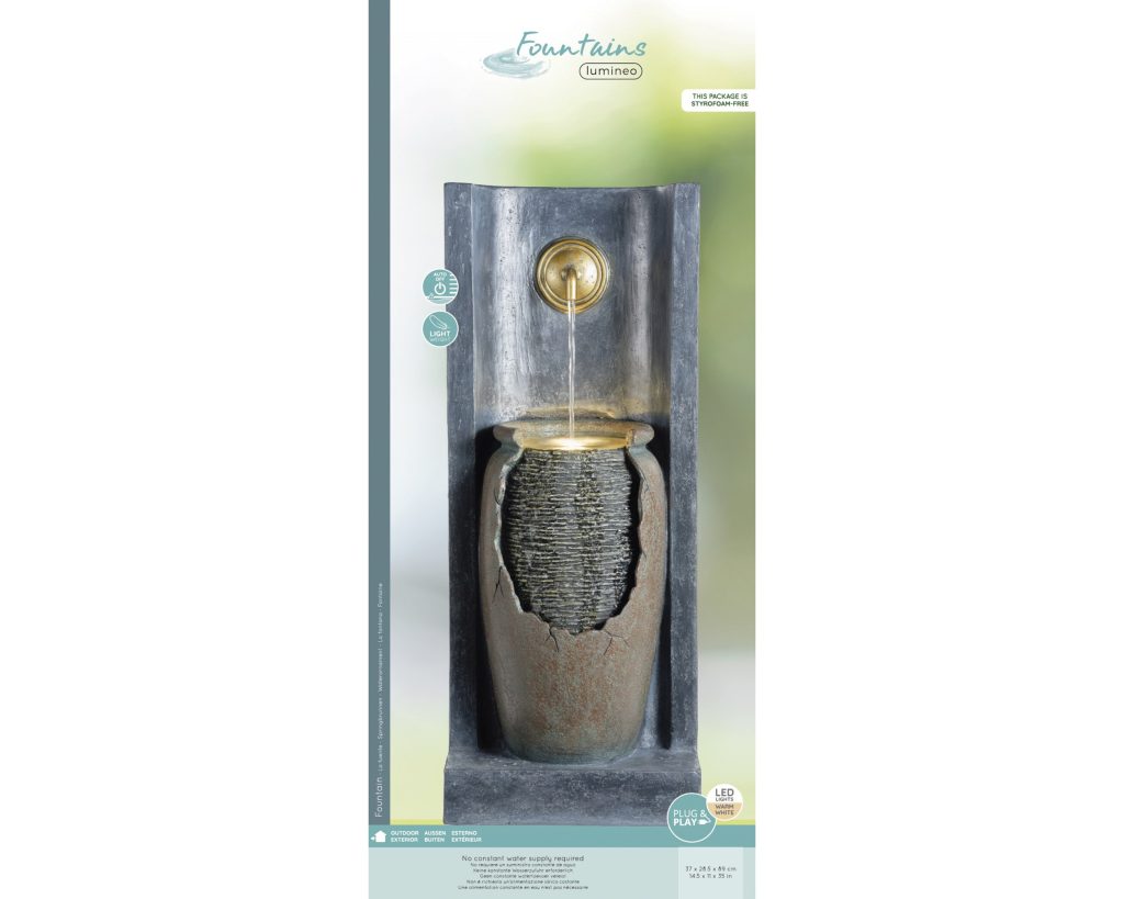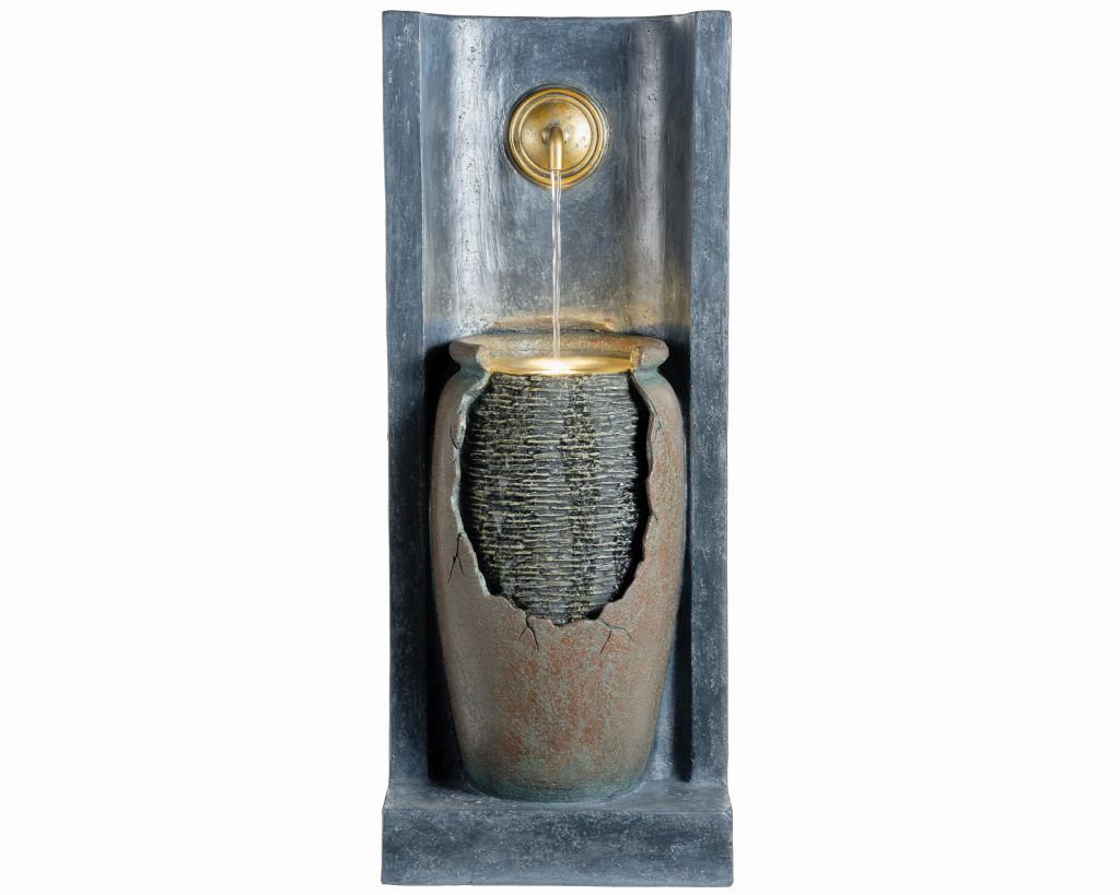 Elevate your space with this Izumi modern wall-style fountain, where a sculptural vessel catches a smooth stream of water illuminated by warm white LED lighting. Sleek, lightweight, and plug-and-play, it adds a refined, spa-like ambiance to outdoor walls, patios, or entryways—no constant water supply required