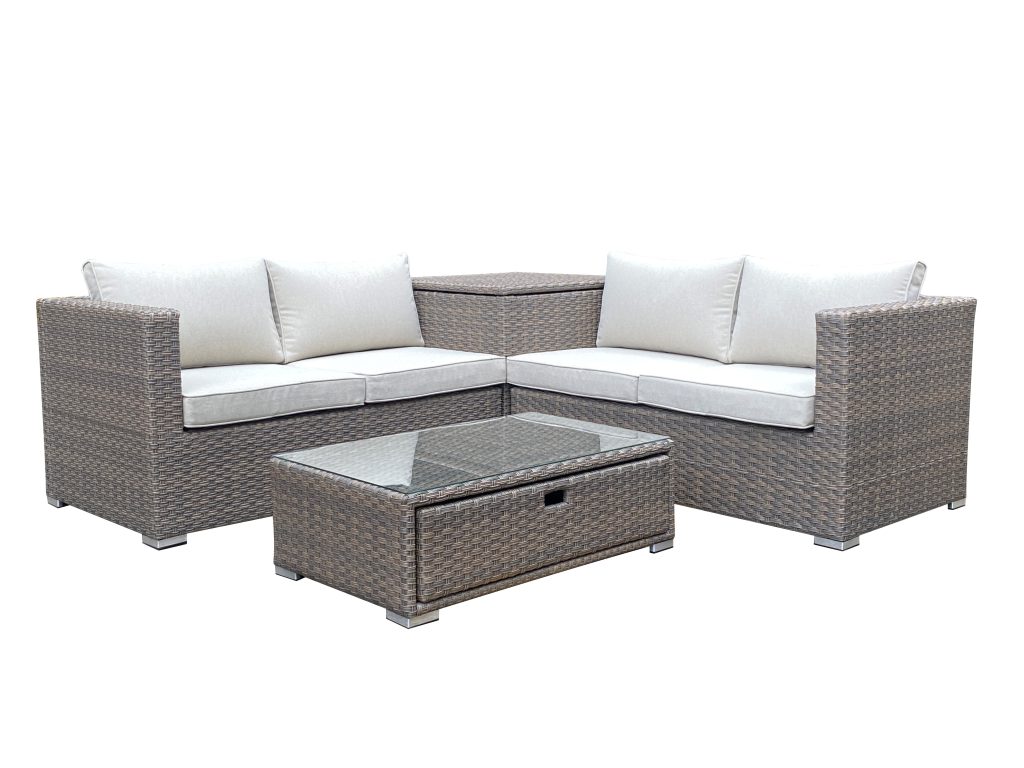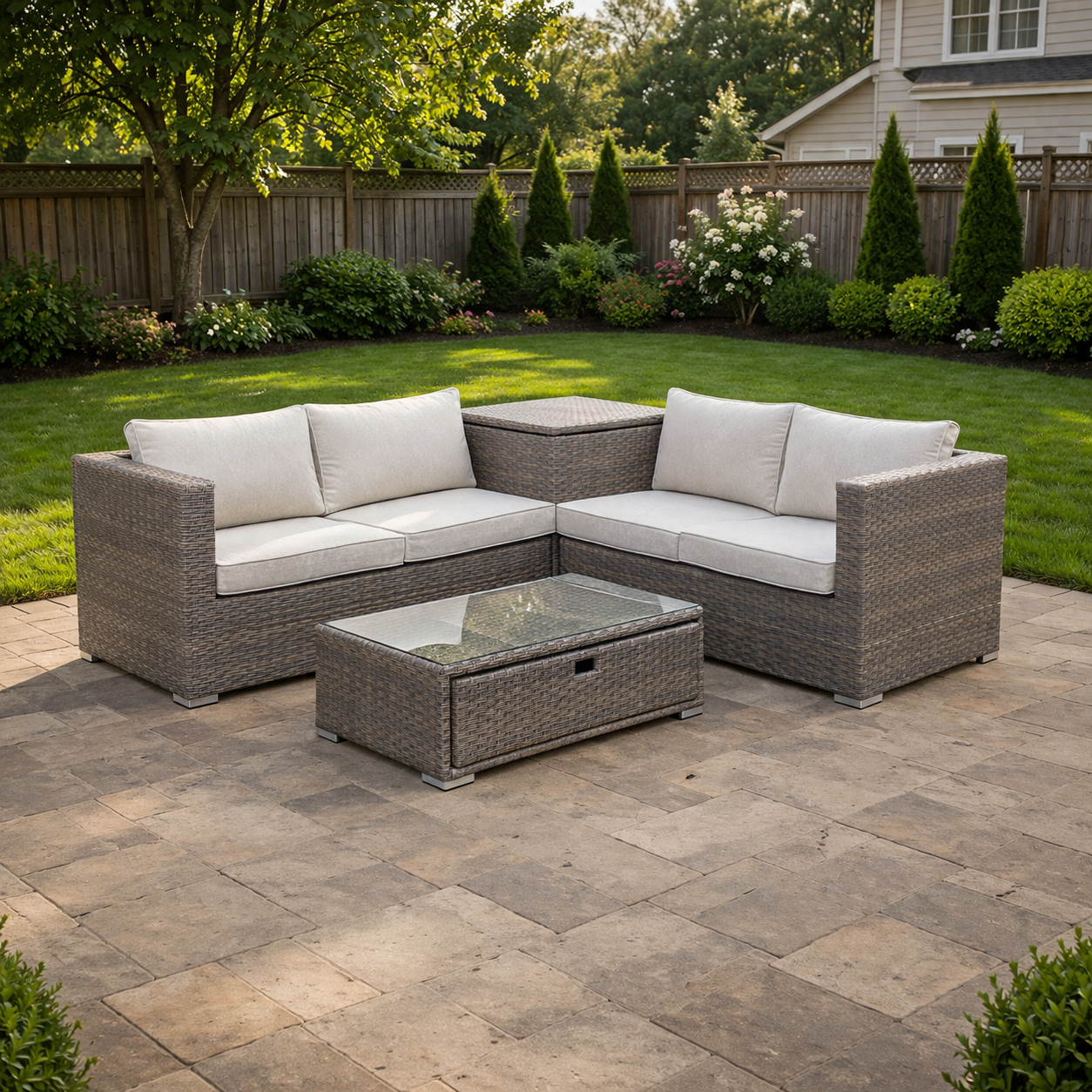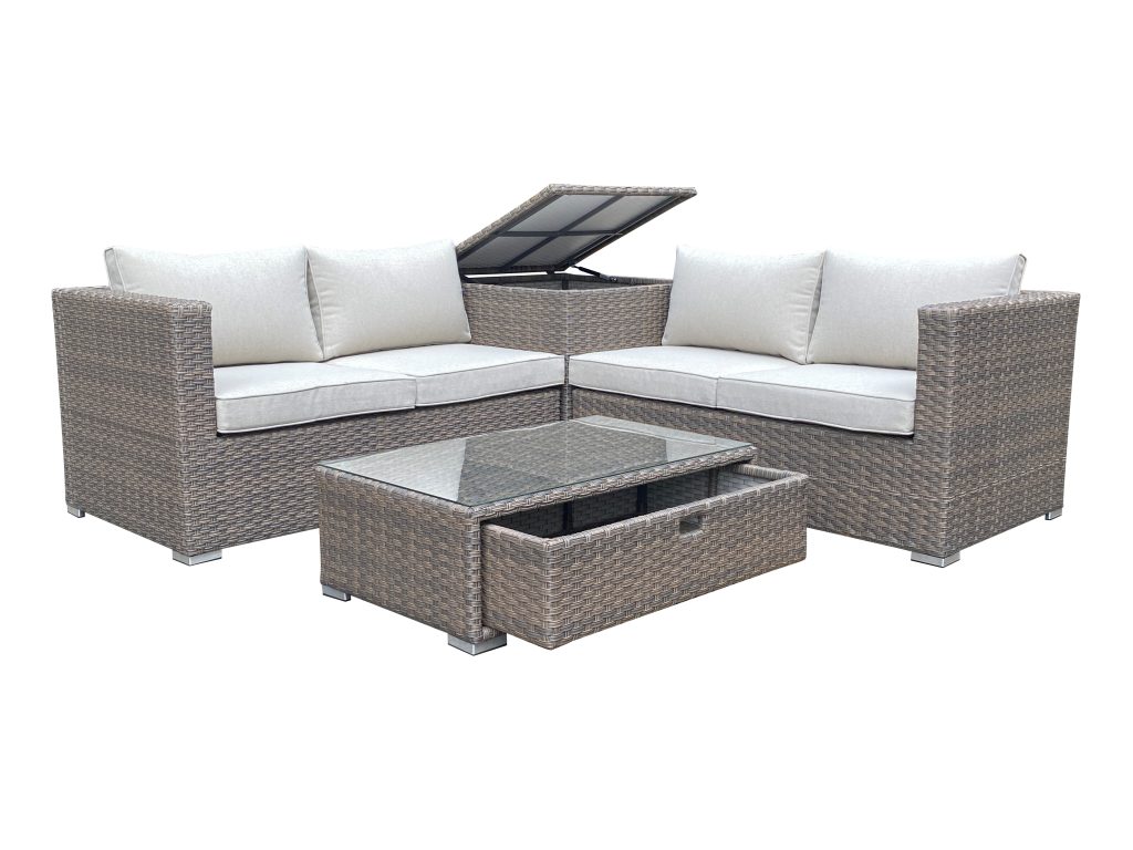 Relax in style with the Kayla 4pc Conversation Set. The hand-woven all-weather wicker frame pairs with plush, light cushions for a clean, coastal look. An L-shaped layout seats family and friends comfortably, while the matching coffee table features a sleek glass top and handy hidden storage—perfect for keeping essentials close and clutter out of sight. Durable, low-maintenance, and ready for any patio or deck.