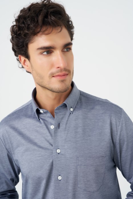 The Leo Chevalier Men’s Knit Button Down LS Shirt offers a modern twist on a classic style. This 100% cotton knitted shirt features a timeless button-down collar and a notched chest pocket. Designed with a regular fit and constructed with fully fused and taped seams, this shirt provides a sharp and comfortable look. The matching trim adds a refined detail, making this a versatile piece that can be dressed up or down for any occasion.