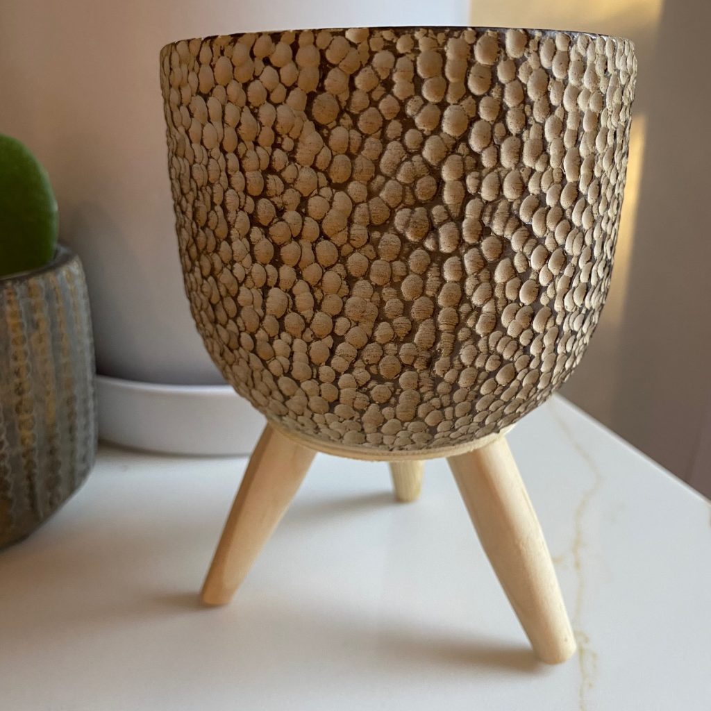 Trendy textured Cement Pot on Natural Wood Legs.