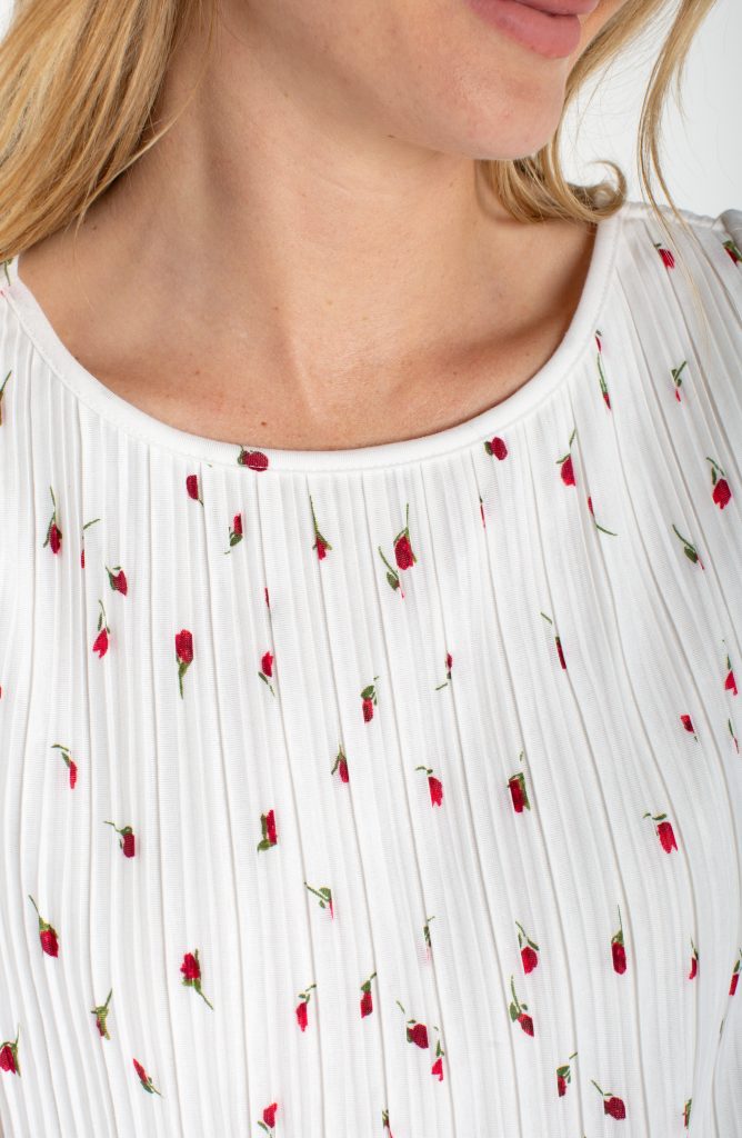 Feminine and fresh, this flutter sleeve knit top features a graceful boat neckline and a charming white and red floral print. Soft, comfortable, and easy to style — perfect for casual days or dressed-up moments.