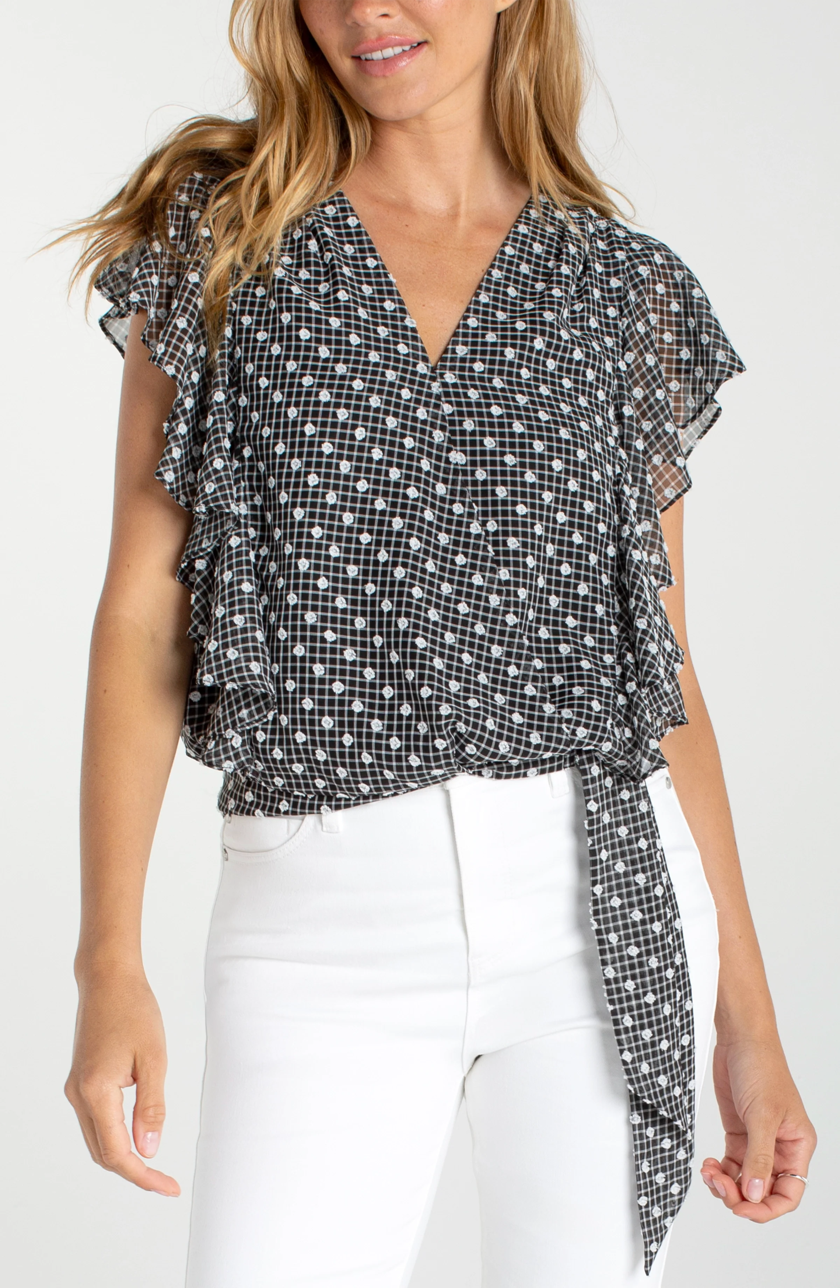 Liverpool Short Ruffle Sleeve Top (Black and White Plaid)