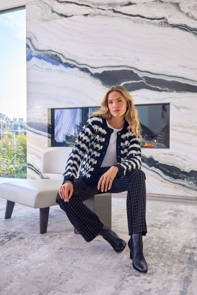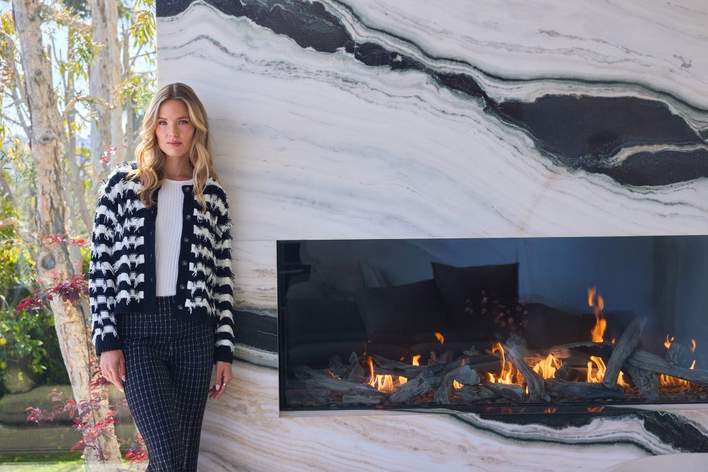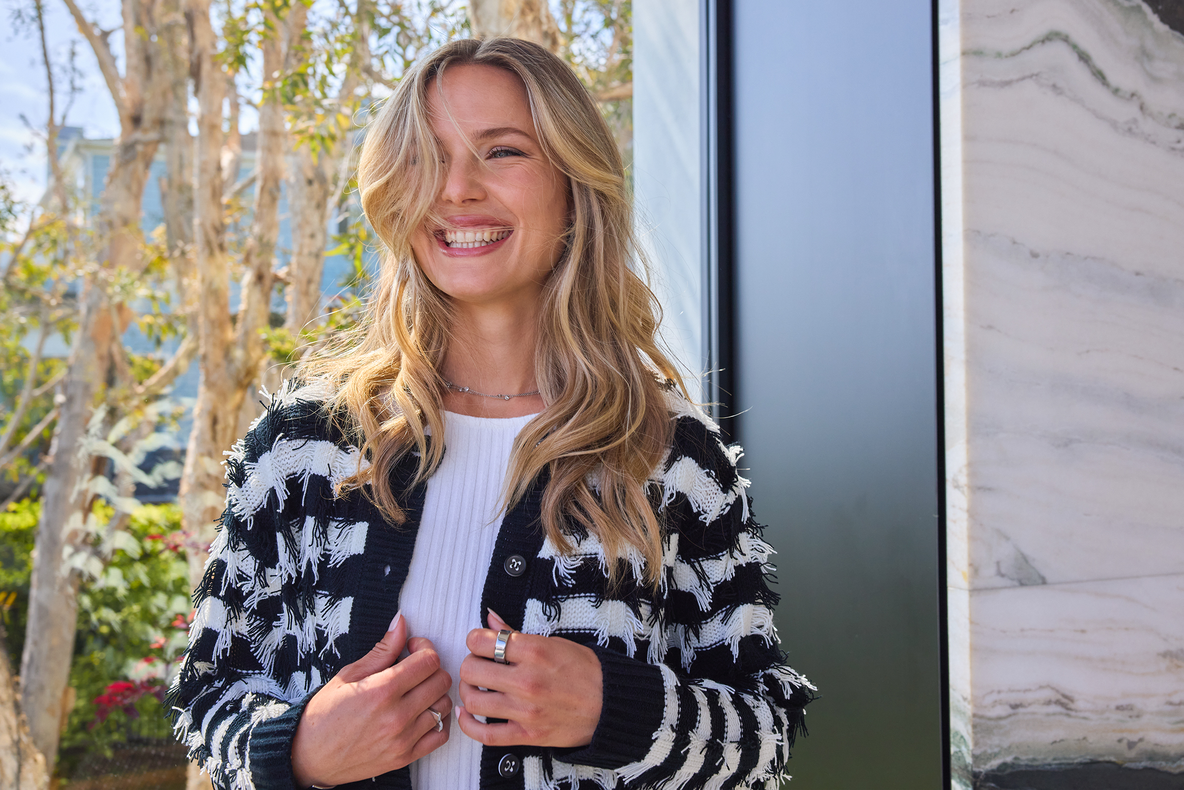 Make a statement with this black and white striped knit cardigan. Designed with eye-catching fringe detailing, a button-front closure, and a slightly cropped silhouette, it offers a modern twist on a classic layering piece. Perfect to wear over a tee or blouse, this versatile cardigan transitions effortlessly from casual days to polished evenings.