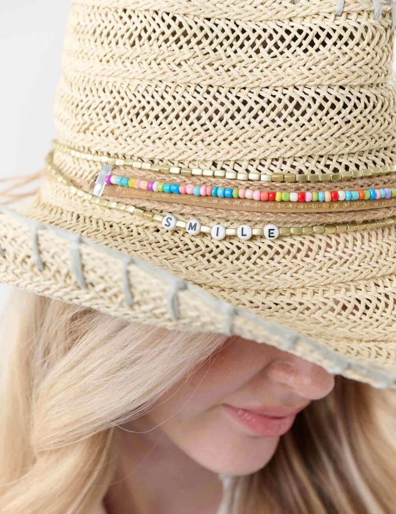 LOEVENICH ladies’ cowboy hat made of 100% paper in a casual boho style (41 x 11 cm). Lightweight, crushable and ideal for summer & festivals. Wide, malleable brim with coarse decorative stitching protects against the sun and can be individually adjusted. Elastic lining band ensures a perfect fit. Multi-row hat band with pearls, gold-colored plates and leather band with “SMILE” cubes as a stylish eye-catcher.