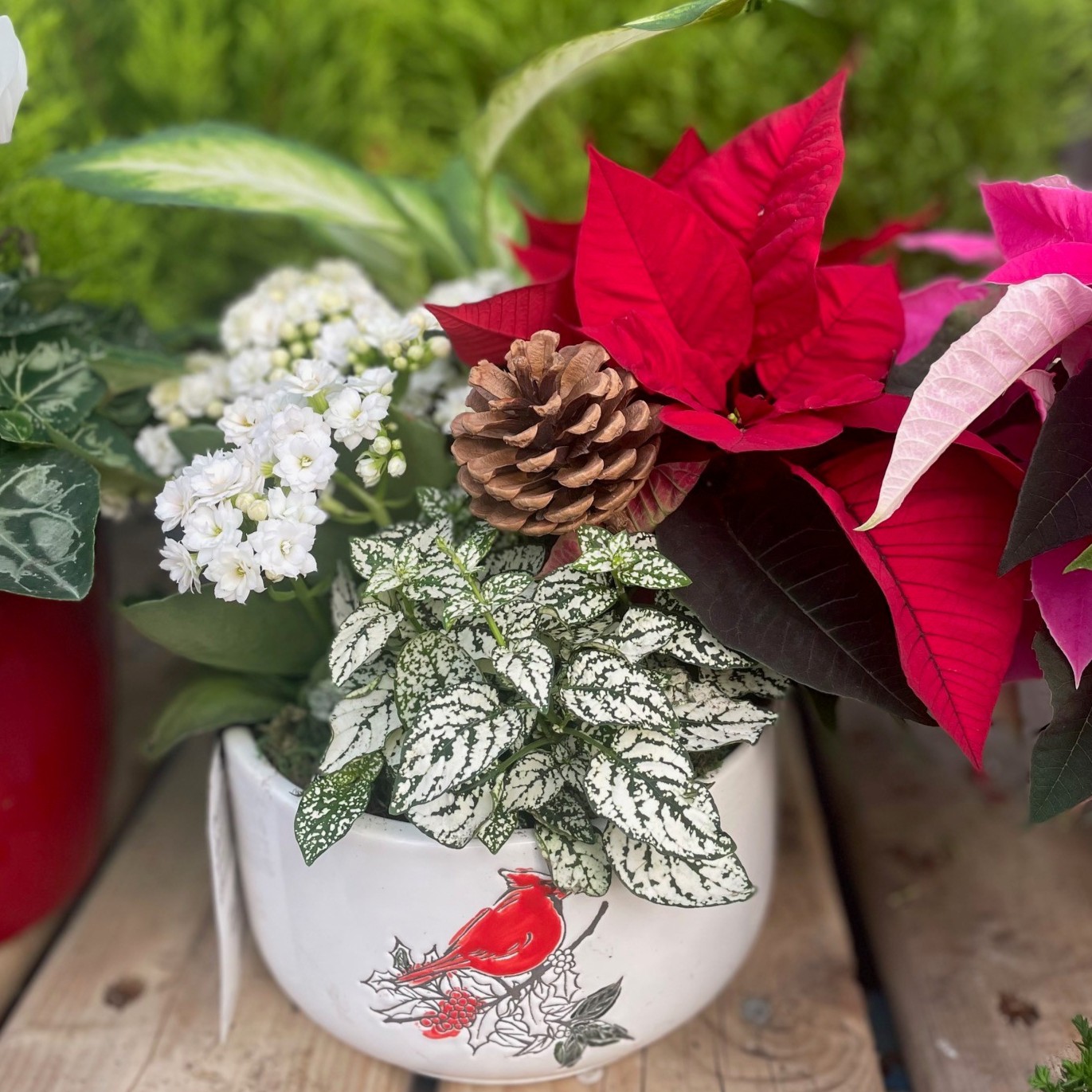 A timeless holiday favorite, the Mary Cardinal Arrangement brings festive warmth and natural beauty to any space. Set in a 6.75″ ceramic pot adorned with a bright red cardinal and winter holly design, this piece features lush greenery and assorted Christmas blooms in vibrant seasonal hues. Each arrangement is unique — flower colours and varieties may vary — making every piece a one-of-a-kind holiday treasure.